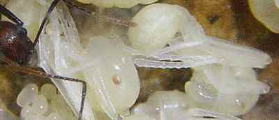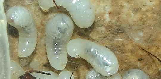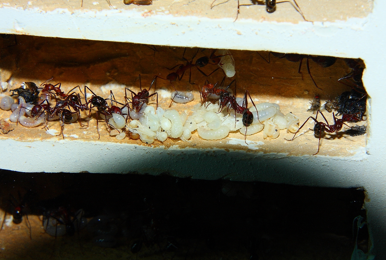Der Wassertank war ausgelaufen und nur im Bereich des Geflechtsstopfen, der kein Wasser anzog, konnten die Ameisen ihren Nachwuchs überlebensfähig lagern.