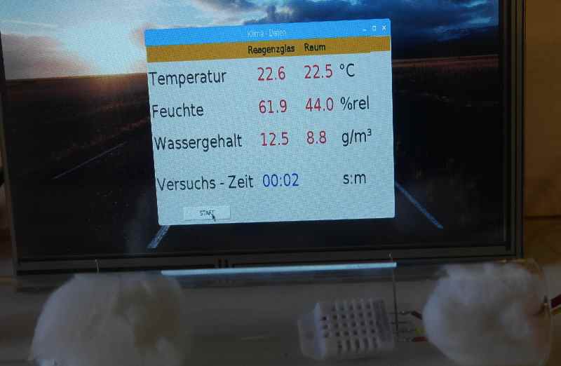 Ergänzt werden die Werte durch die absolute Feuchtigkeit in g/m³ und die Versuchszeit in Stunden und Minuten.