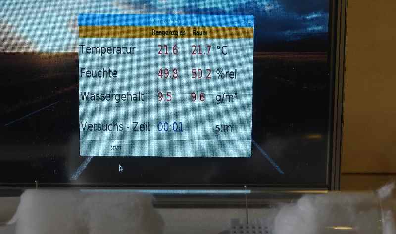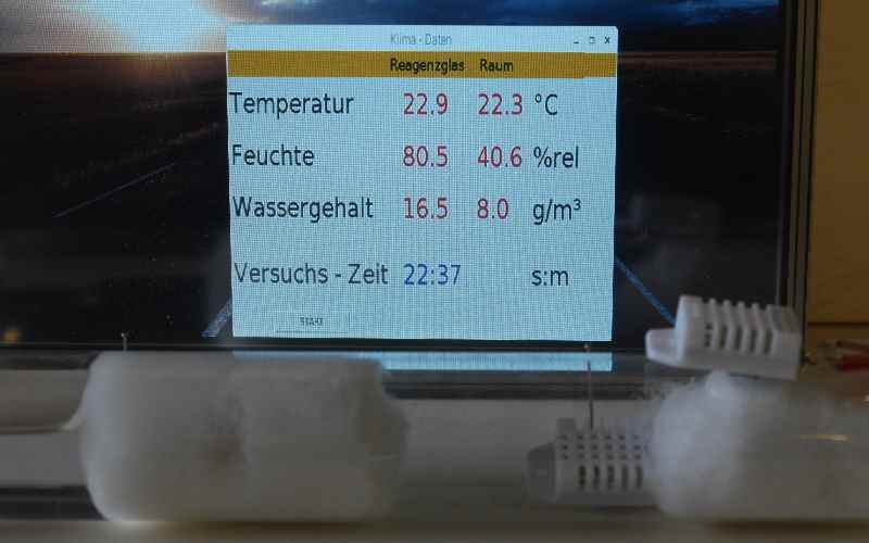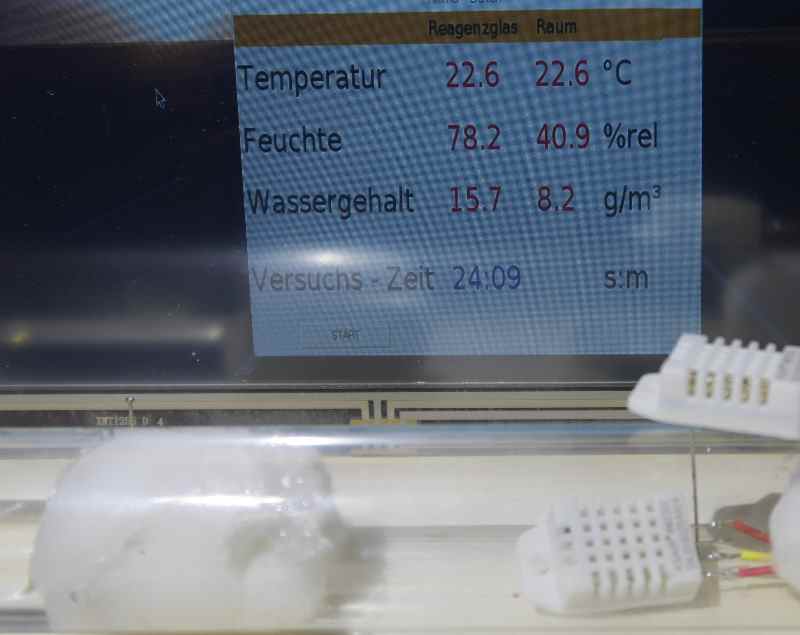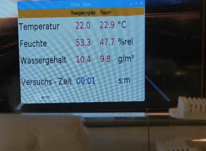 Ergänzt werden die Werte durch die absolute Feuchtigkeit in g/m³ und die Versuchszeit in Stunden und Minuten.