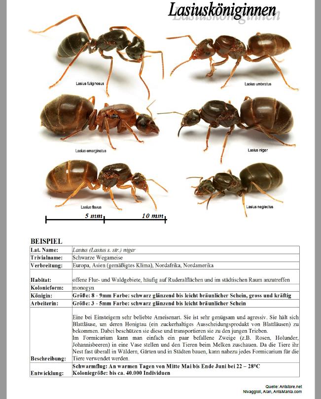 Das gesamte Handbuch beläuft sich derzeit auf 13 Seiten und behandelt Lasius, Myrmicas, Formicas, Camponotus und einige kleinere Arten. Das gesamte PDF wird noch vom Antstore geprüft werden. Ich versuche ihn davon zu überzeugen, das Werk dann für Euch zum freien Download anzubieten. So bekommen es alle Interessenten und die Urheberrechte sollten in absolut trockenen Tüchern sein.
