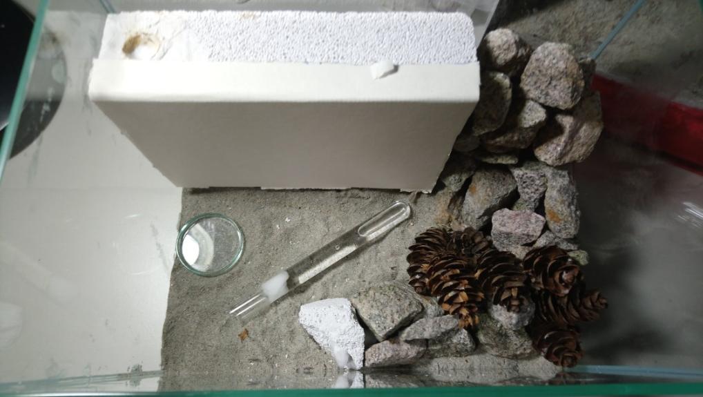Major so ca. 16mm groß ist. Um einiges größer als eine Camponotus nicobarensis Arbeiterin. Da sie in einem Nest ankamen, musste ich erst gar keins bauen. Also holte ich ein 30x20x20cm Aquarium (12l) aus dem Keller und begann mit der Einrichtung der Arena. Zu aller erst setzte ich das Nest in die Arena. Das Nest hatte einen Schlauchausgang, etwa 30cm lang. Ich wollte diesen gerne behalten und dachte nach wie ich den ihn schön verstecken könnte. Da kam mir eine Idee in den Kopf, die eigentlich auch recht schön aussieht! Ich nehme einfach ein paar Steine und baue sozusagen einen kleinen Berg. Unten könnt ihr dann die Bilder sehen! Ich wollte dann gar nicht lange warten und öffnete gleich den Schlauch. Die Ameisen stürmten regelrecht raus und nach kurzer Zeit waren in der kleinen Arena schon 30-40 Arbeiterinnen. Diese haben sofort die Tropfen Zuckerwasser entdeckt und ehe ich wieder in das Becken gucken konnte, war alles weggeschlürft! Nun kamen auch mehrere Majore angerannt und ich musste schnell wieder das Zuckerwasser nachfüllen.