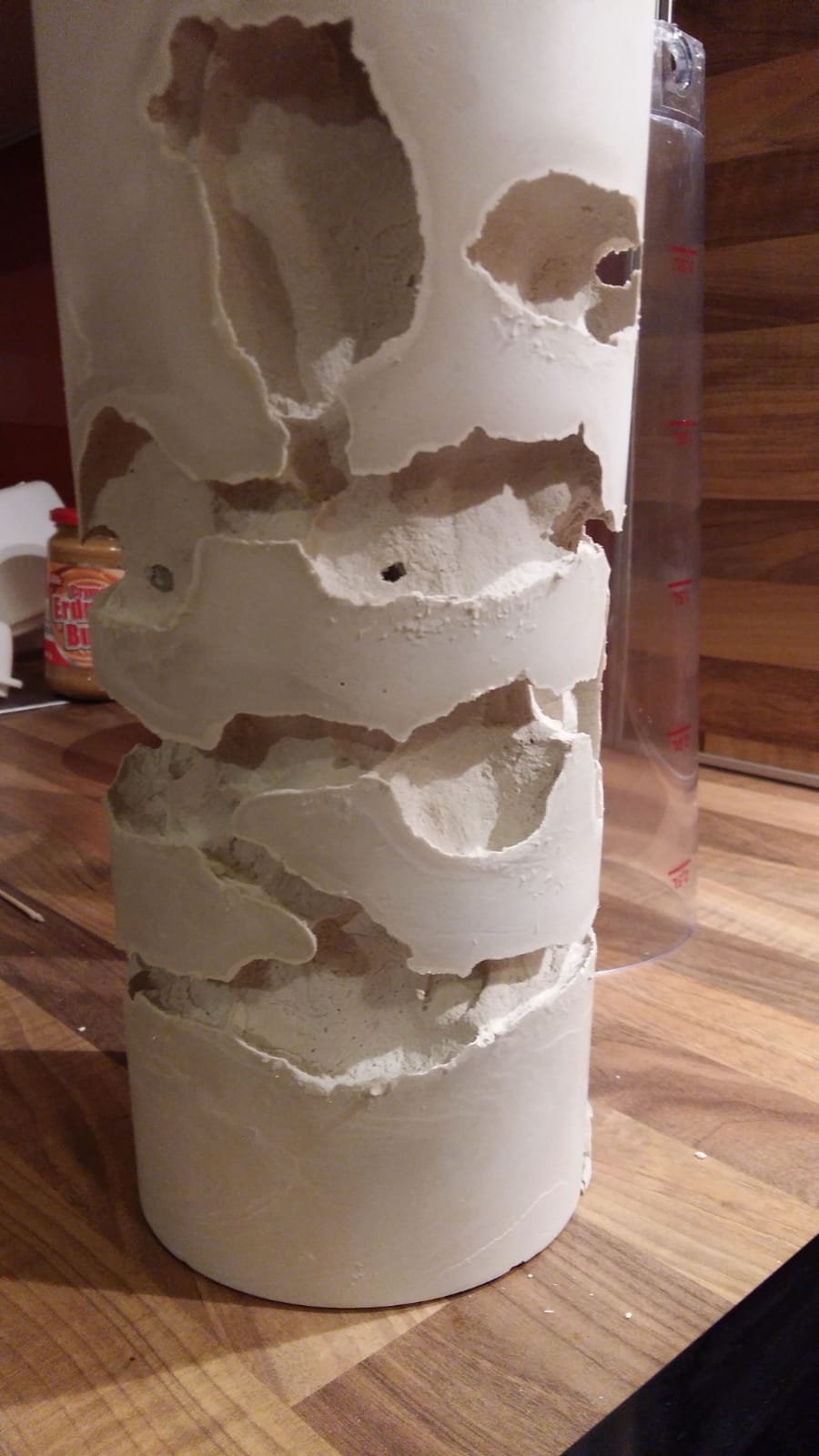 B) Es hat sich eine Art grĂŒner Belag gebildet in zwei Kammern, glaube fast nicht dass es Schimmel ist, da es wohl um die 30 Grad Celsius in der SĂ€ule hat und bei solchen Temperaturen das Pilzwachstum wieder deutlich abnimmt. Vielleicht eine Reaktion des Gips mit dem Salz in der Knete?