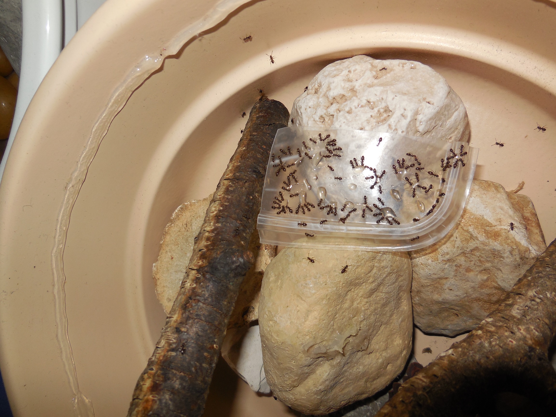: überquellende Restmülltonnen bieten zumindest zeitweise Schmeißfliegen. Check von Farm 1: es tummeln sich viele Ameisen. Die Oberfläche ist definitv trocken, weiter unten herrscht augenscheinlich auch Trockenheit. Die Farm wurde daher mit 5ml bewässert. Wenigstens funktioniert in dieser Farm der Ausbruchsschutz. Allerdings musste ich den Bewässerungsschlauch kürzen, ein 2.Stück Watte war am Ausgang zu tief hineingerutscht und ließ sich nicht mehr entfernen.