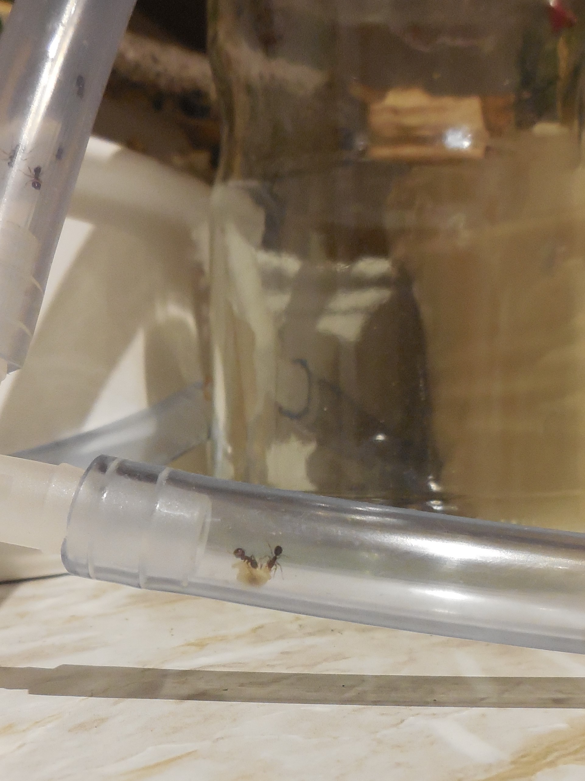 In Farm 2 befindet sich nur noch etwa 2/3 der Sollmenge an Substrat. Der Aushub, der mittlerweile v.a. in den Schläuchen und der eckigen Glasarena lagert, scheint überwiegend von dort zu stammen. Er wurde teils ganz schön weit transportiert. Eine "Sandbank" im Schlauch befindet sich rund 1m vom Nest entfernt.