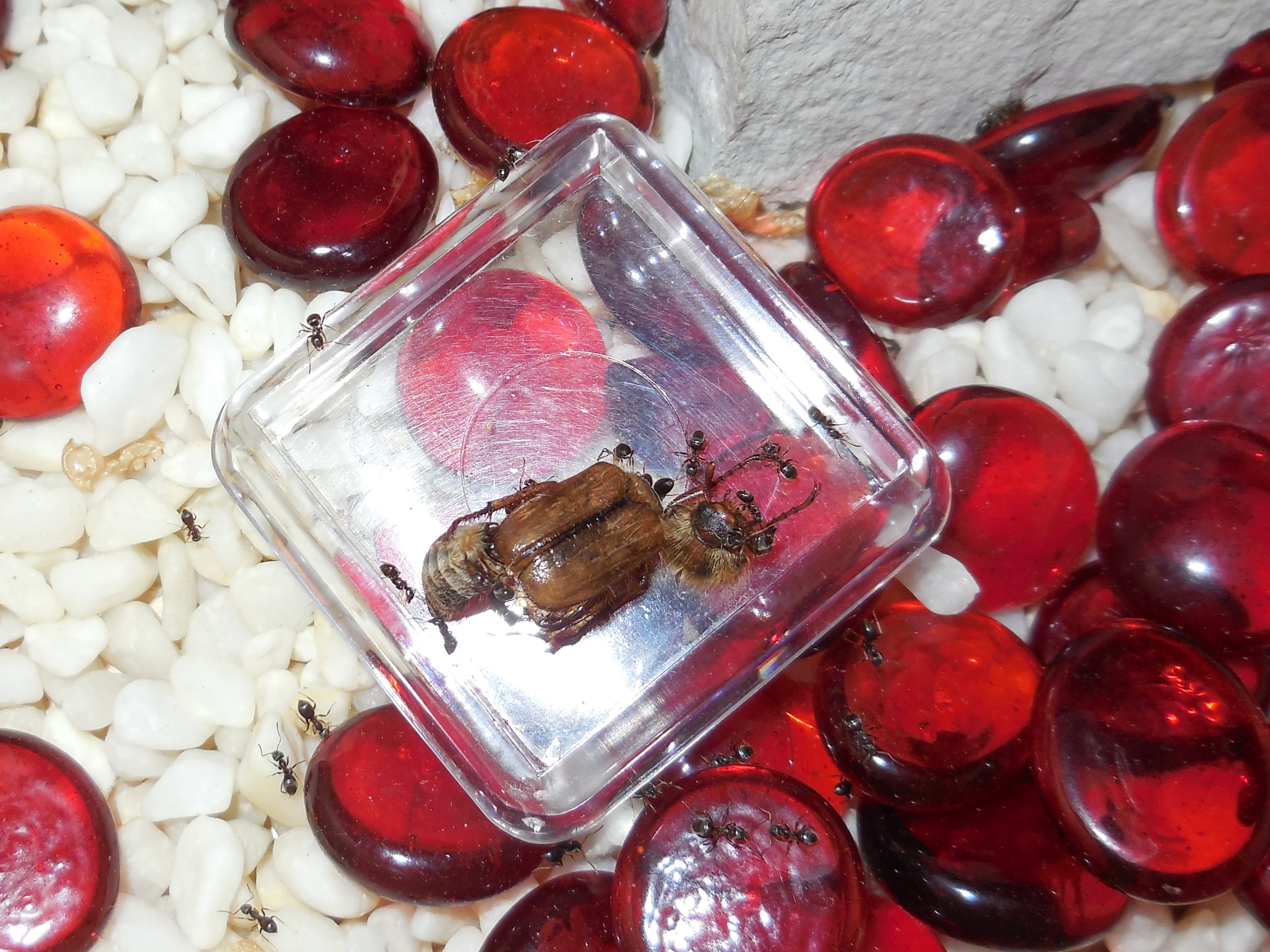 Abends herrschte bereits reges Treiben in der Arena. Einige klebten im Honig, die konnte ich jedoch noch abwaschen und retten.