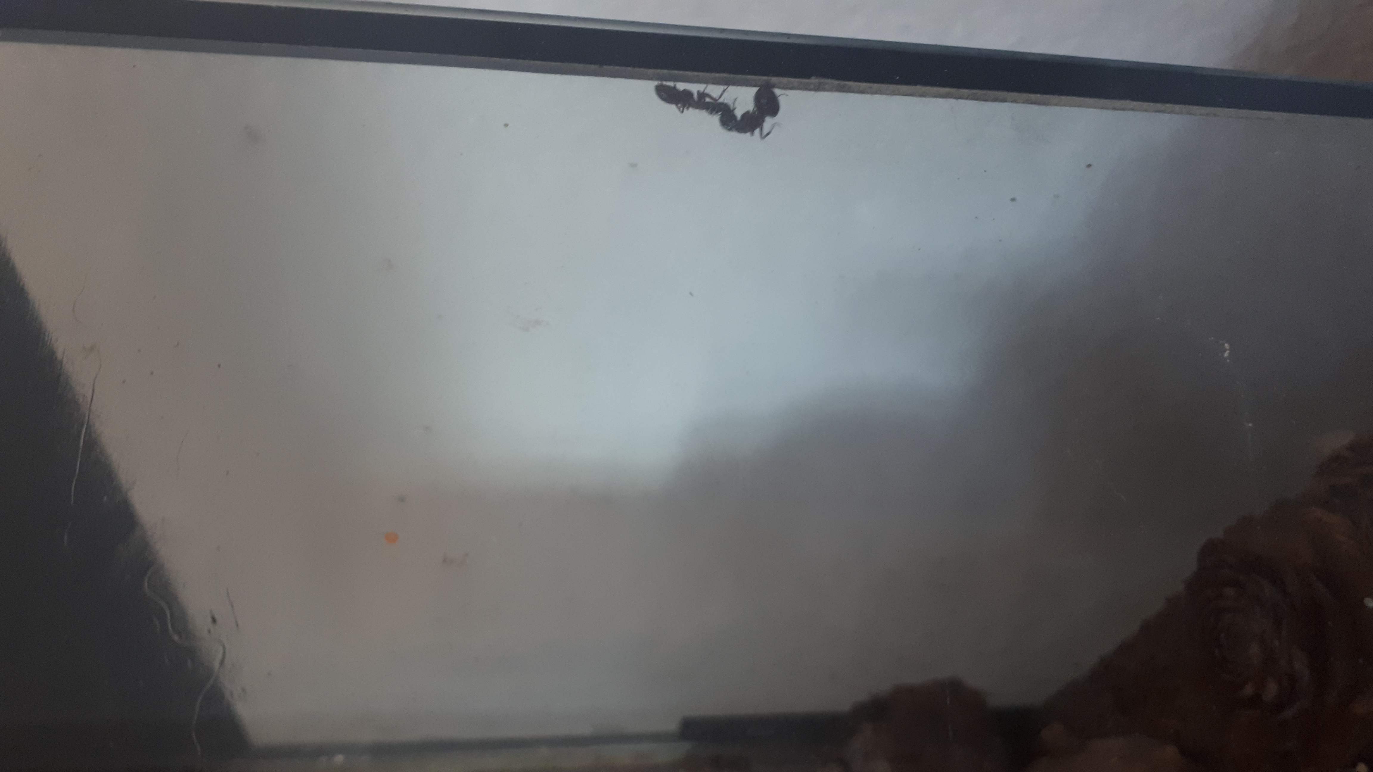 Nach 10 Tagen war klar. Im Nest befinden sich diverse Leichen, die nicht herausgeräumt werden. Das Nest ist zwar offen, aber die Kammer mit dem Ausgang wird nicht wie sonst komplett geräumt. Ich sah eine Major, die die Scheibe hoch klettern wollte, aber es nicht schaffte.