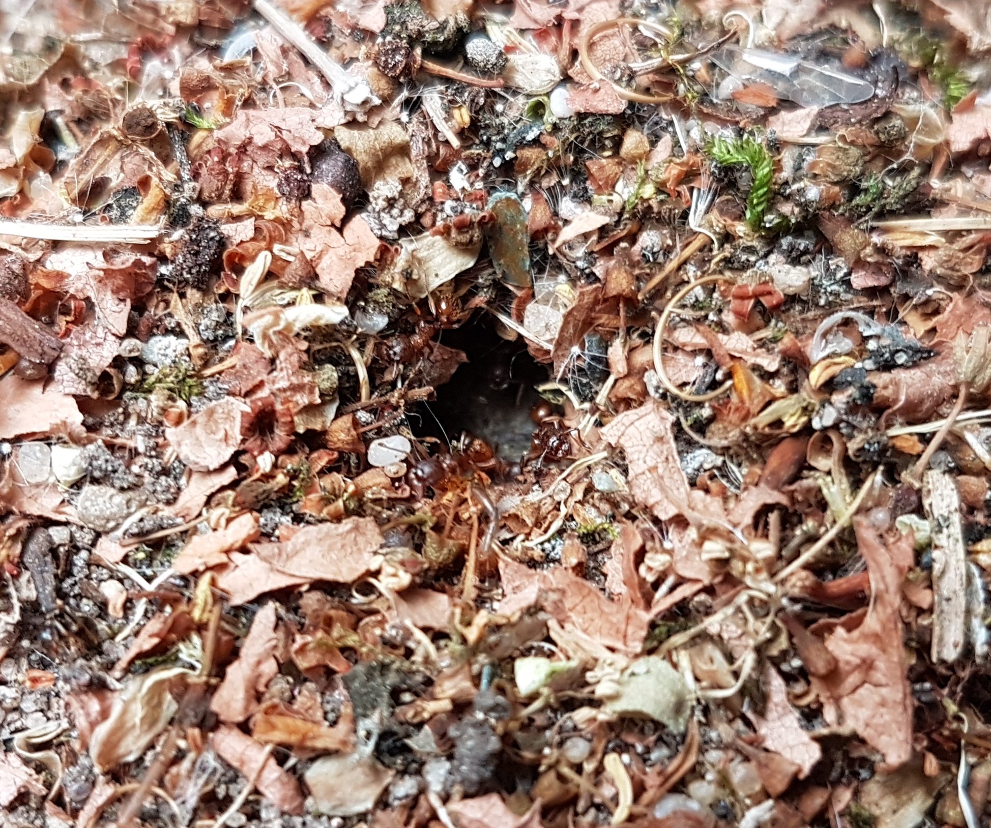 Der Nesthügel aus Pflanzenmaterial wächst weiter… ich schätze ihn mittlerweile auf etwa 1,5cm Höhe. Der Eingang liegt an der höchsten Stelle (hier eine neues Foto):
