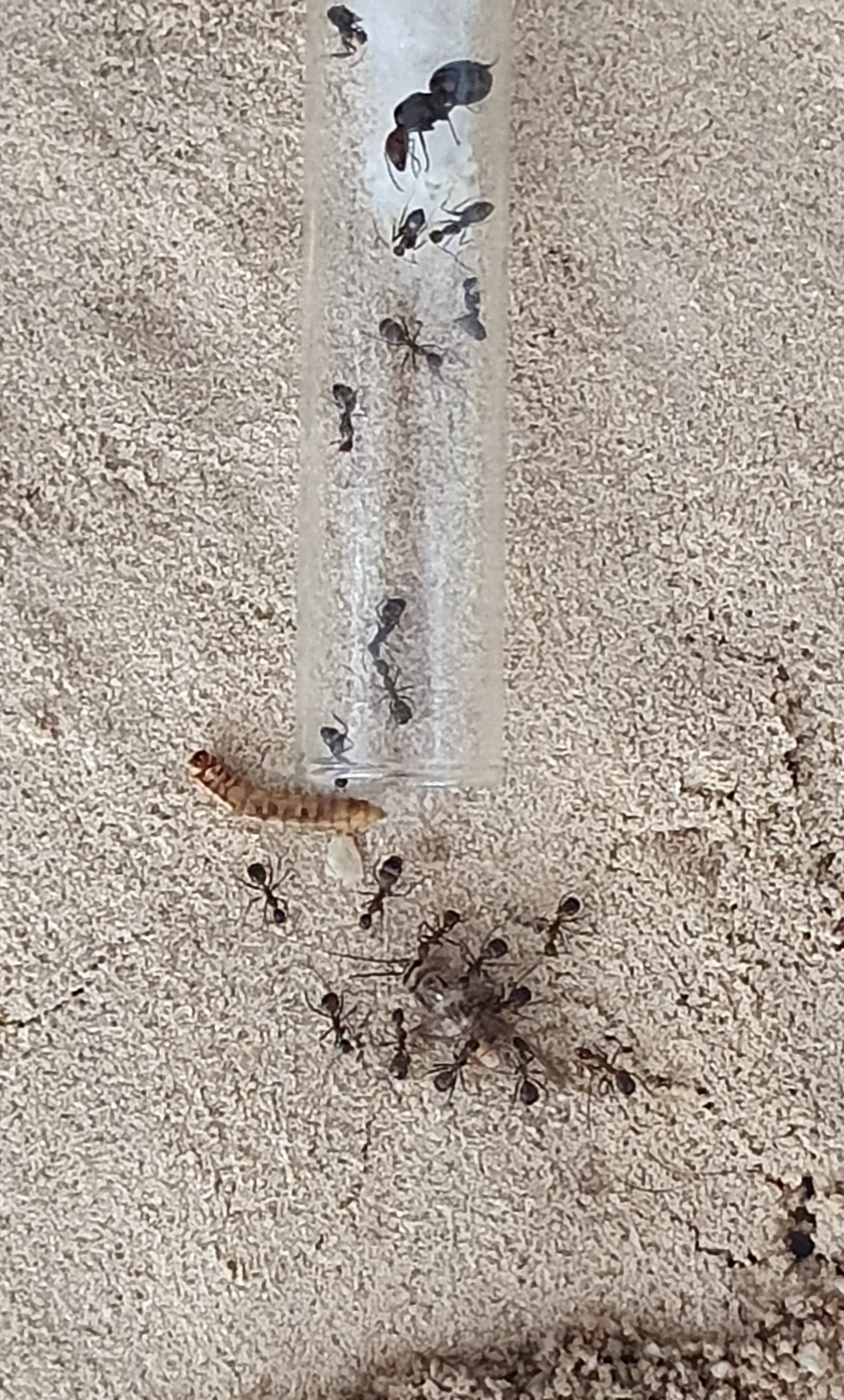 Ich gab ihnen als Begrüßungsgeschenk einen vorher getöteten Mehlwurm ,aber außer den an die andere Seite der Arena zu schleppen ,machten sie nix mit ihm .