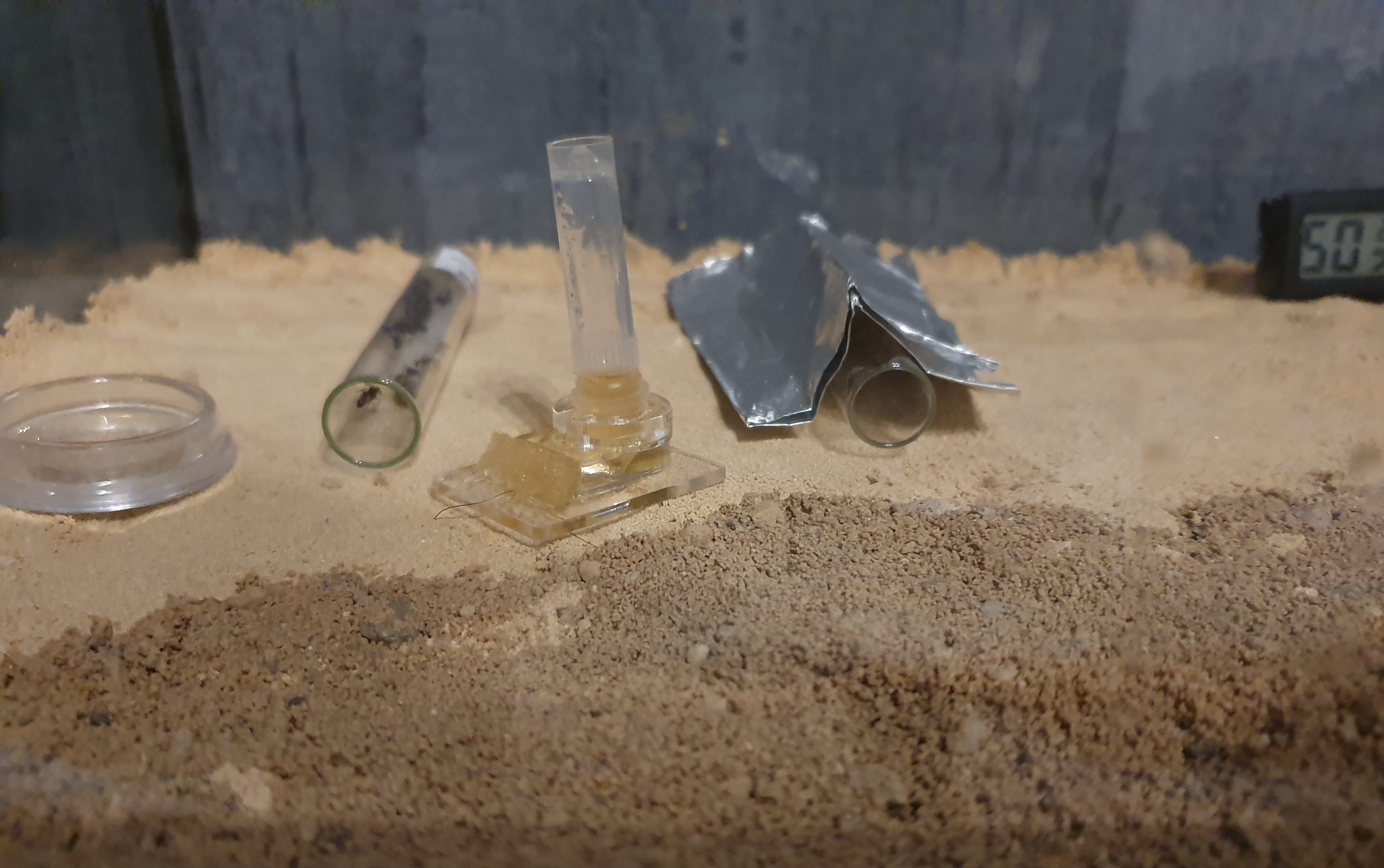 Ich hab in alle 3 meiner Arenen eine Heizmatte mit automatischer Steuerung eingebaut . (sie heizt wenn die Arena unter 26 Grad sinkt wieder auf 28 auf )