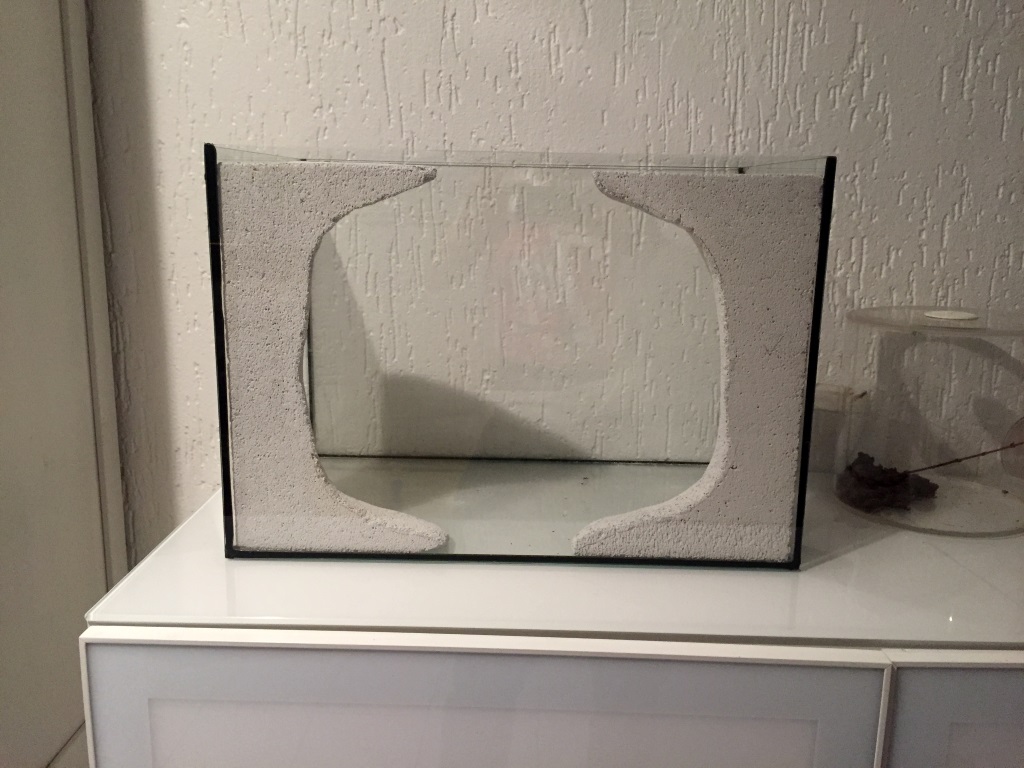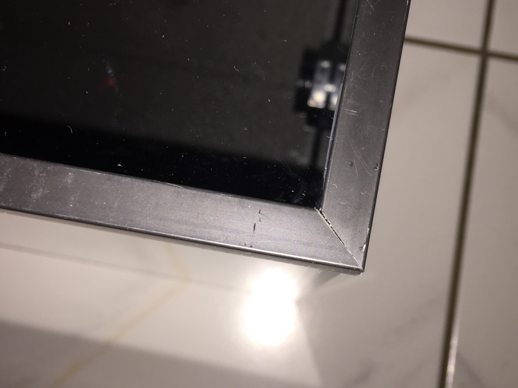 Mit einem "Ceranfeldschaber" habe ich die Silikonreste entfernt und mit 10 x 10 mm L-Profilen einen Rahmen gebastelt. Die Gehrungsschnitte sind überraschenderweise recht passend geworden. Festgeklebt wurden die Schienen mit Aquariensilikon.