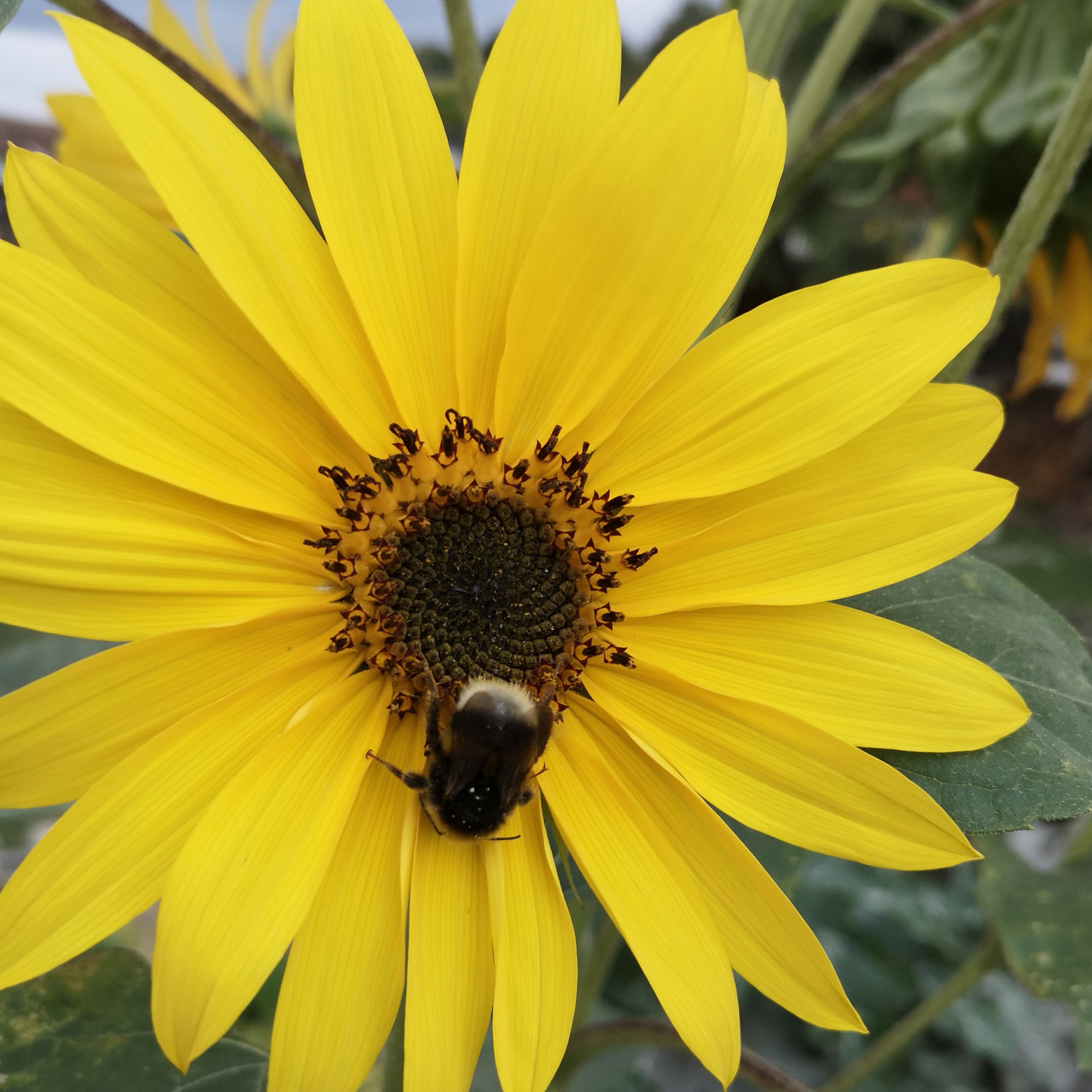 Eine Hummel ruht auf einer SonnenblumenblĂĽte.