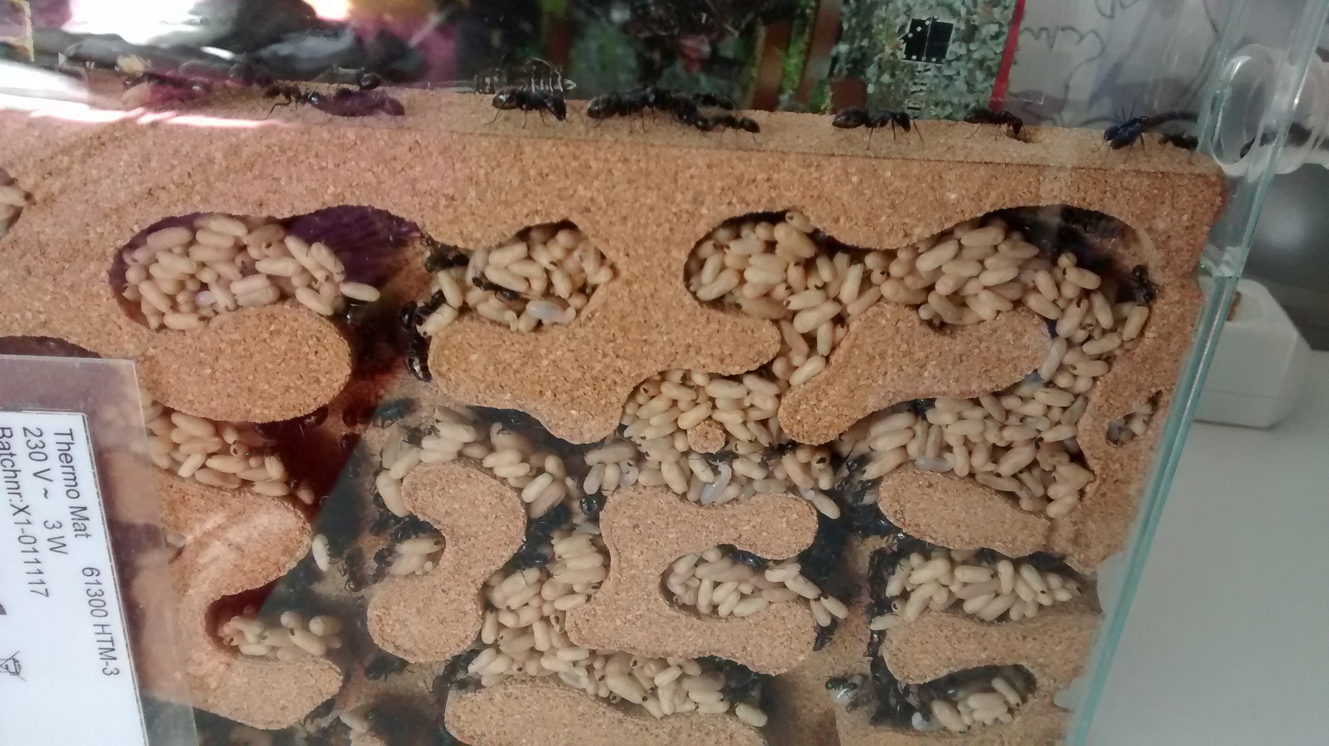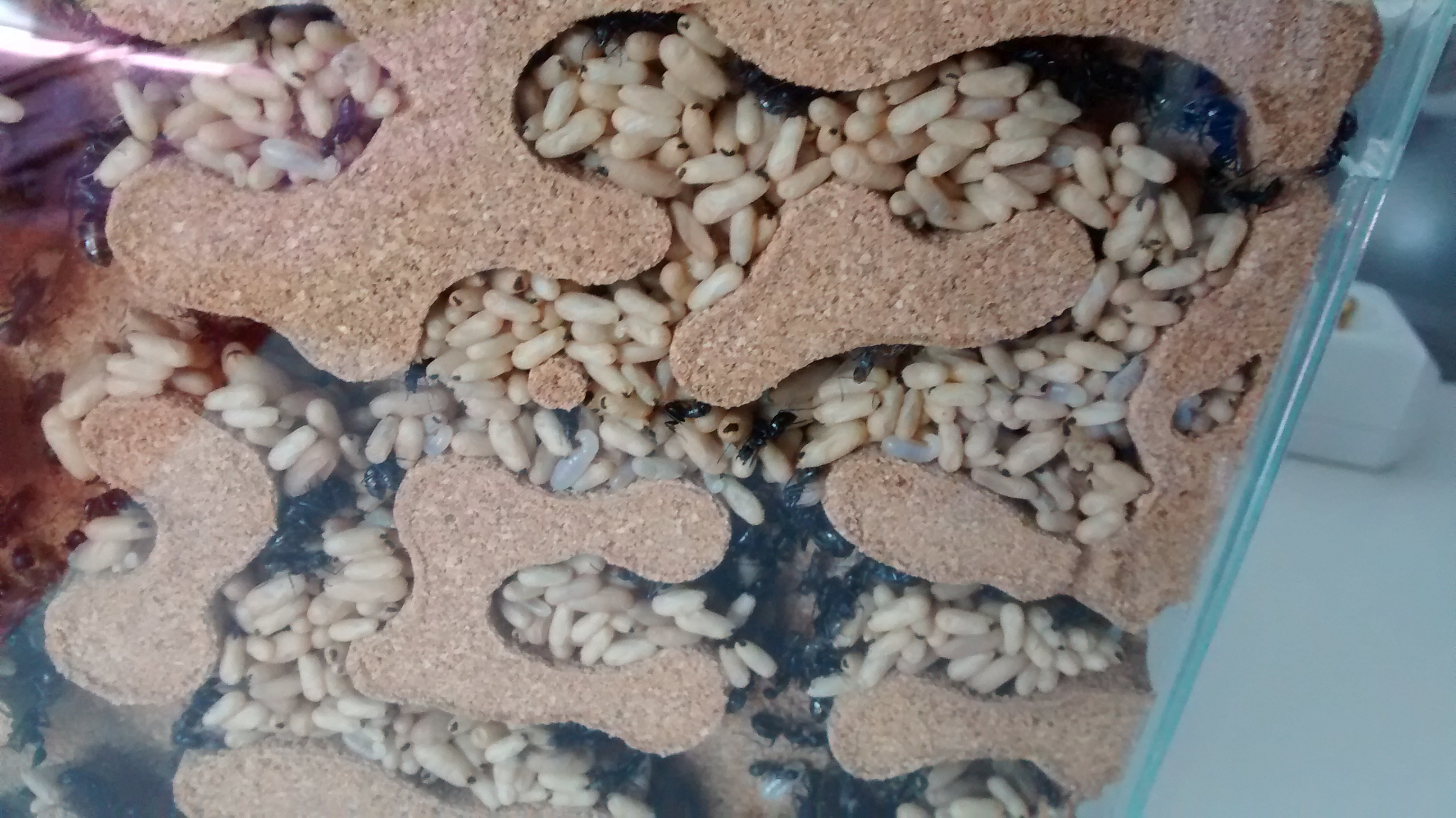 Die Ameisen haben massenweise Brut und beide Nester sind gefüllt mit Puppenkokons und Larven. Hier Fotos von einer der beiden Farmen: