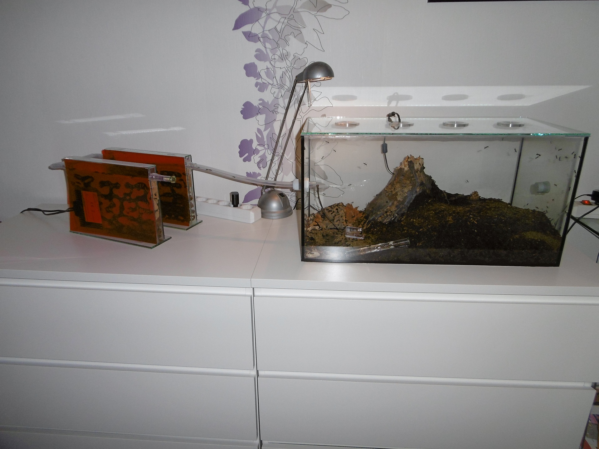 Die Camponotus vagus-Kolonie konnte ich dank der modularen Bauweise recht komfortabel in den Schrank verfrachten. Der Abbau verlief problemlos, beim Zusammenbauen in der Garage sind dann aber zwei Arbeiterinnen den Arbeiten zum Opfer gefallen, als sie eingeklemmt wurden :(. Leider hat sich das nicht vermeiden lassen.