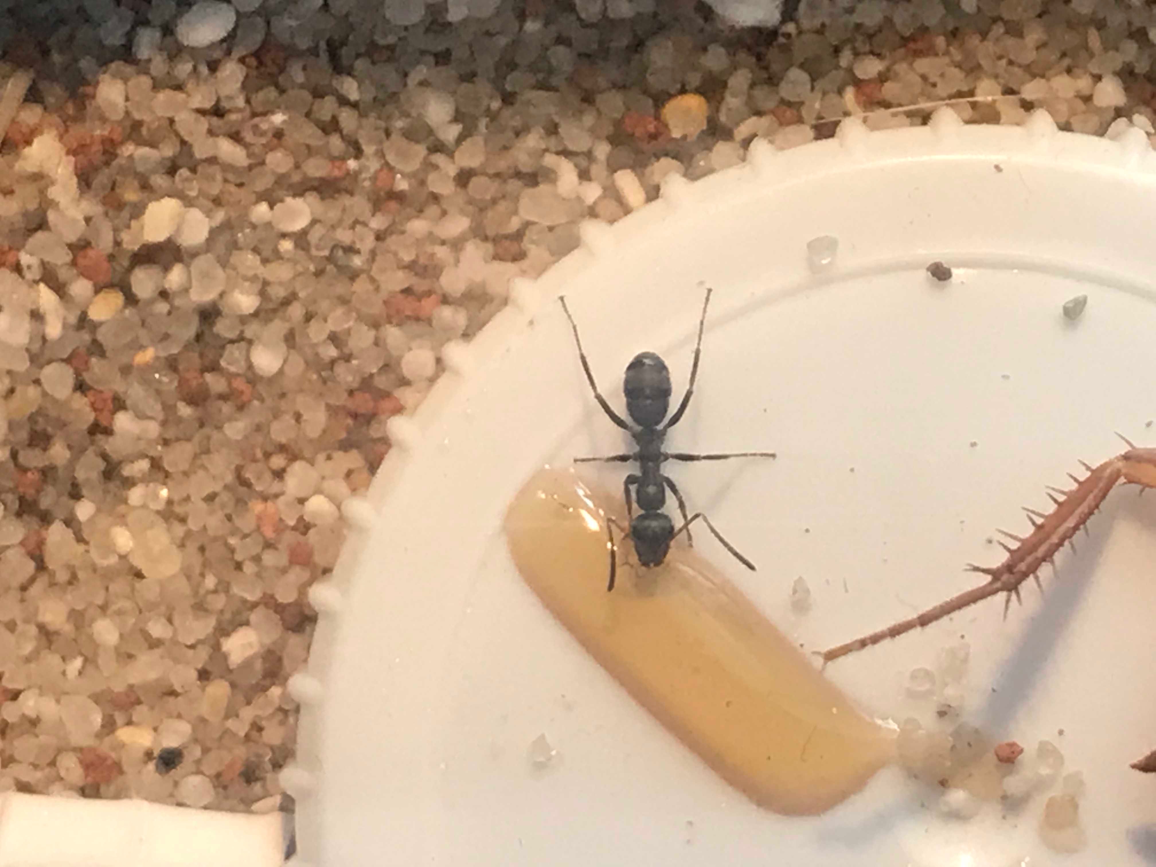Königin im abgedunkekten Reagenzglas in eine kleine Plastebox als Arena gelegt und einen kleinen Strohhalm durch die Watte geschoben. Auf einem kleinen Stein habe ich einen kleinen Tropfen Honig angeboten so das die ersten Arbeiterinnen sich mit ein paar Kohlenhydraten versorgen können. Dieser wurde von der Pflegeperson meiner anderen Ameisen und Haustiere einmal wöchentlich gewechselt.