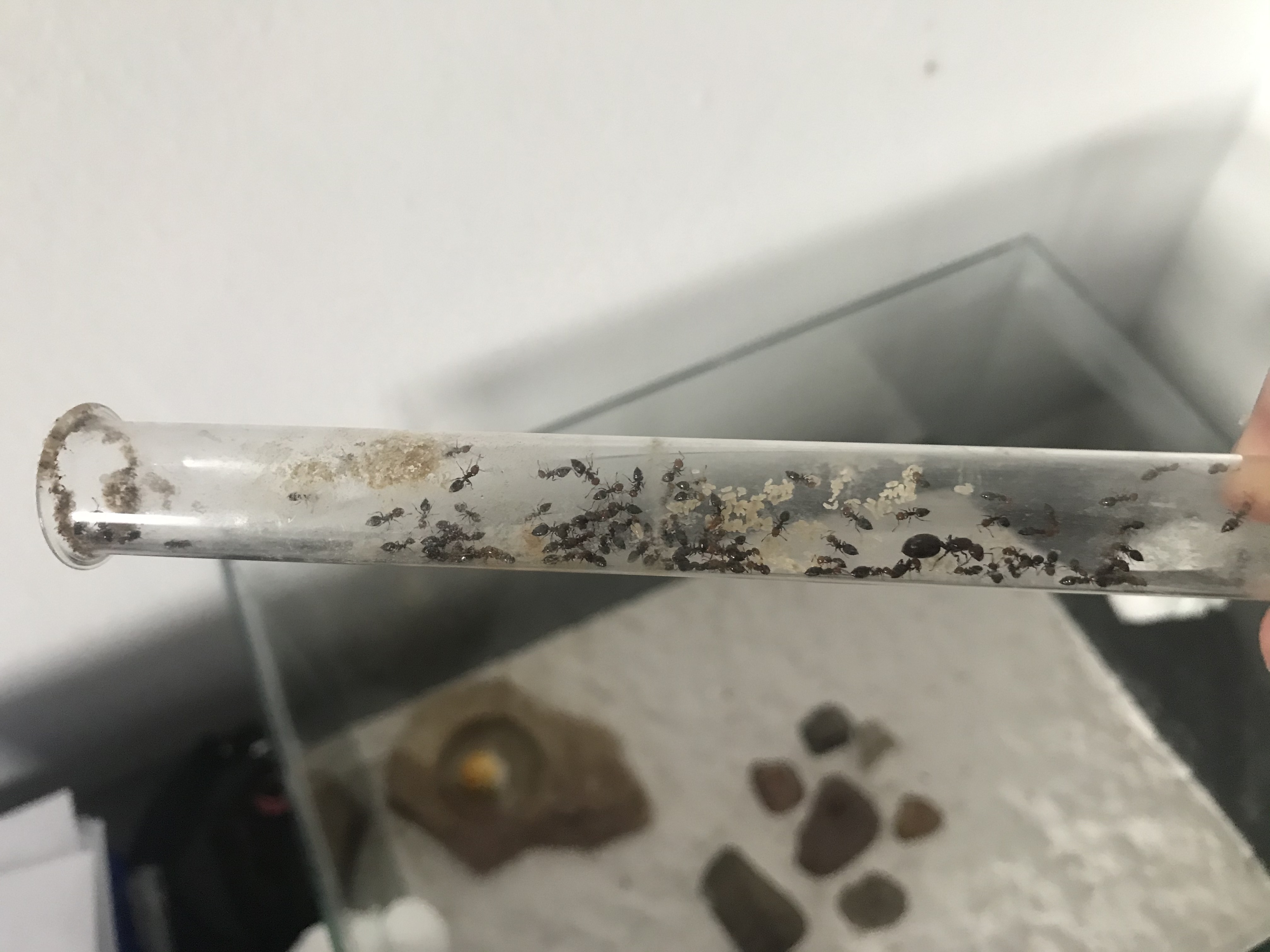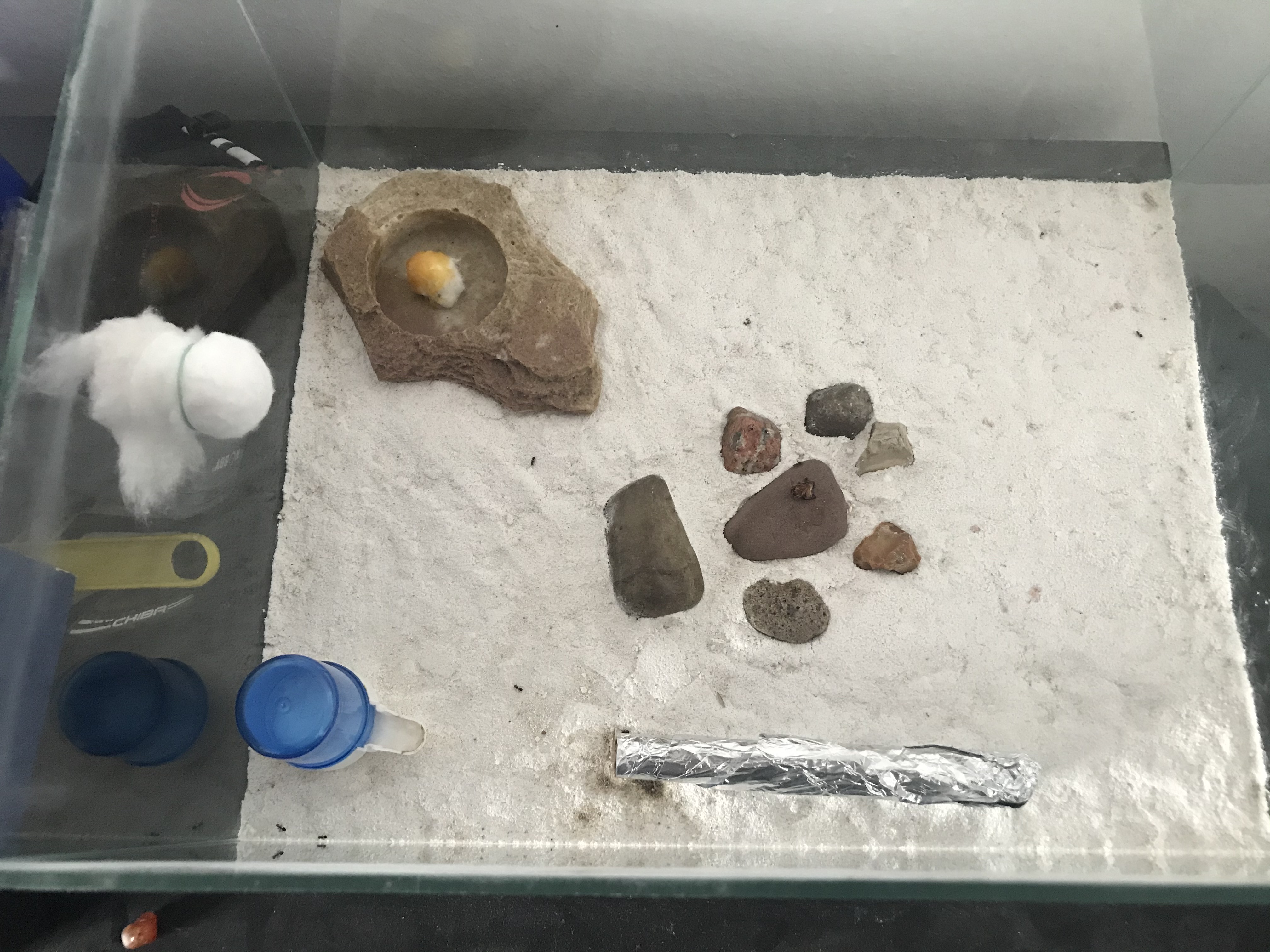 Gekauft habe sie Ende 2018, wenn ich mich recht erinnere waren es da die Königin + 5-10 Arbeiterinnen. Sie waren dann auch direkt in der Winterruhe und ich habe die Zeit genutzt um ihnen eine Arena vorzubereiten. Diese besteht aus einem Glaskasten vom Antstore. Als Bodengrund habe ich eine weiße Sand-Lehm Mischung genutzt, welche ich angefeuchtet und anschließend mehrere Wochen habe durchtrocknen lassen. Entstanden ist dadurch ein super harter weißer Boden, von dem sich die Ameisen super abheben.
