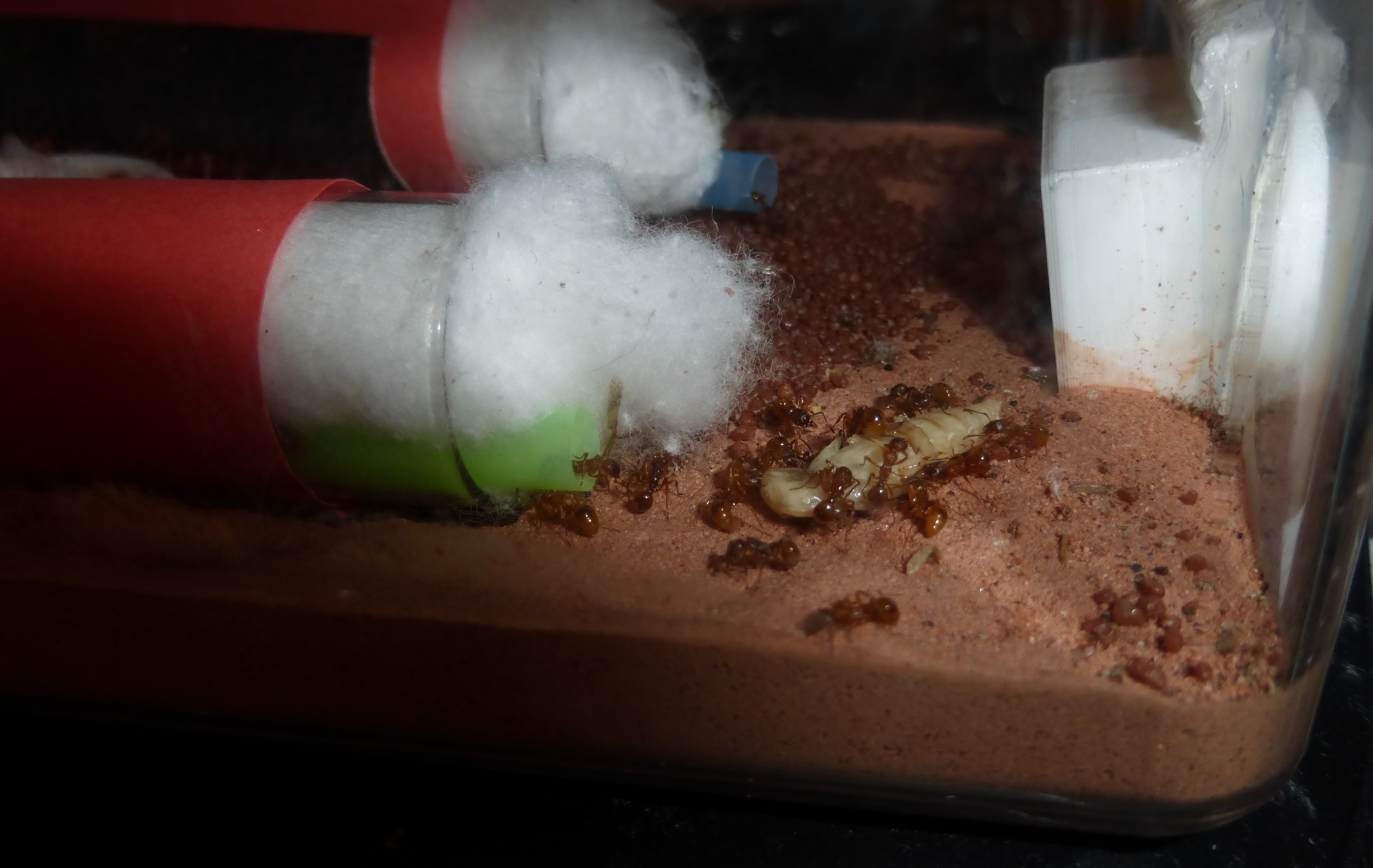 Die Nestarena und ein paar Ameisen, die auf Shrimps herumkauen.