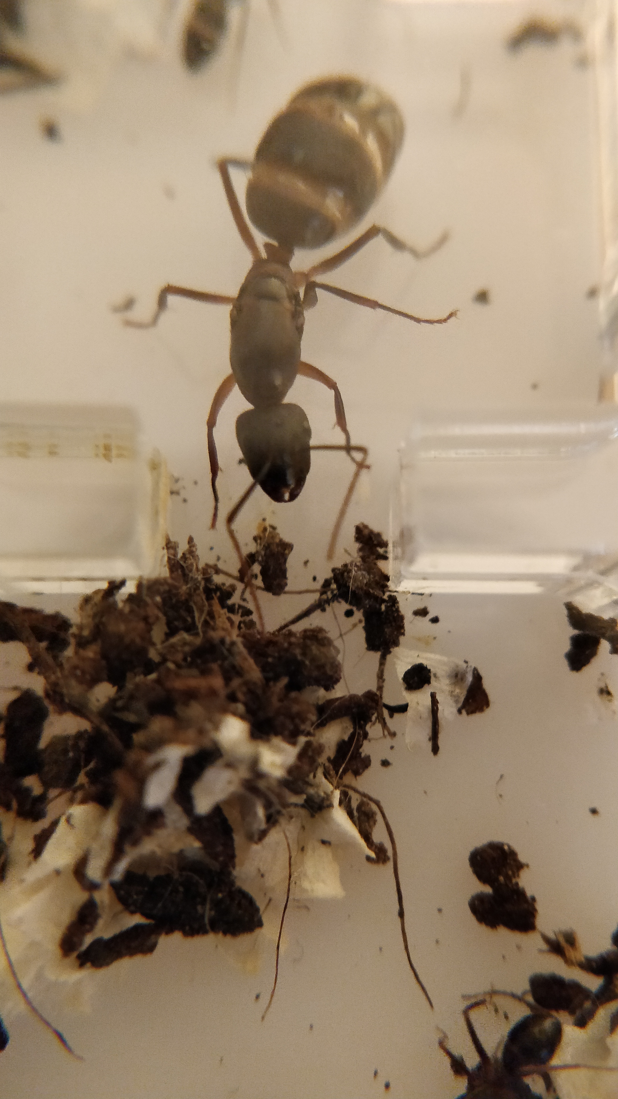 Hier das Nest noch mal komplett von oben. Man kann sehen, wie die Kolonie sich schön eingerichtet hat. Und hier noch wie die Kolonie aktives Feuchtigkeitsmanagement ("Hydroregulation") betreibt in dem sie Baumaterial um den Feuchtigkeitspilz auftürmt: Ich konnte eine schöne Nahaufnahme derKönigin machen und bin erstaunt wie angeschwollen der Gaster ist. Hoffentlich ist dort noch einiges an Nachwuchs unterwegs:
