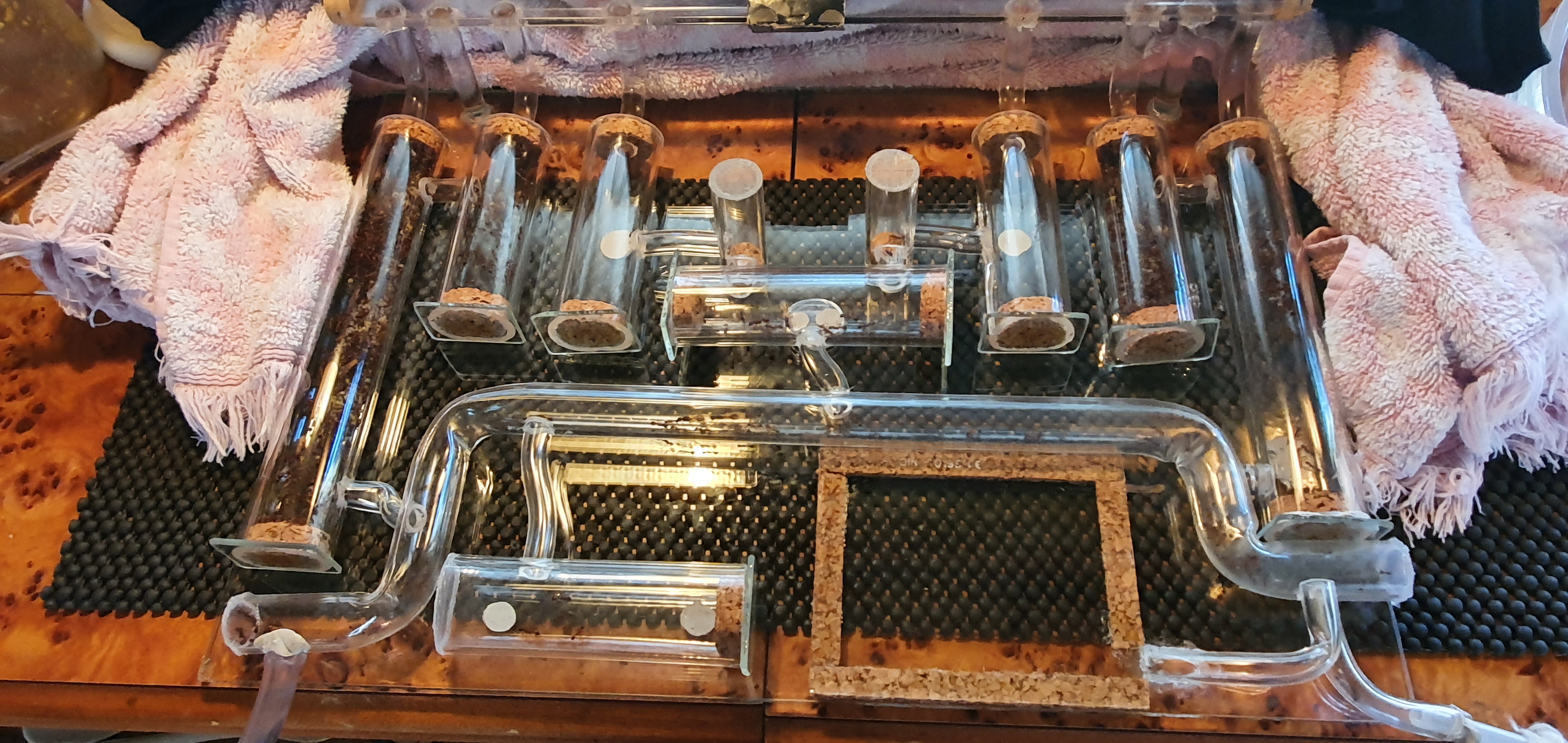 Was mir am meisten Kopfzerbrechen bereitet hat, war die richtige befeuchtung der Nesträume, schluss endlich habe ich es bei der Lösung belassen, die Rohre mit kleinen Seramiskugeln