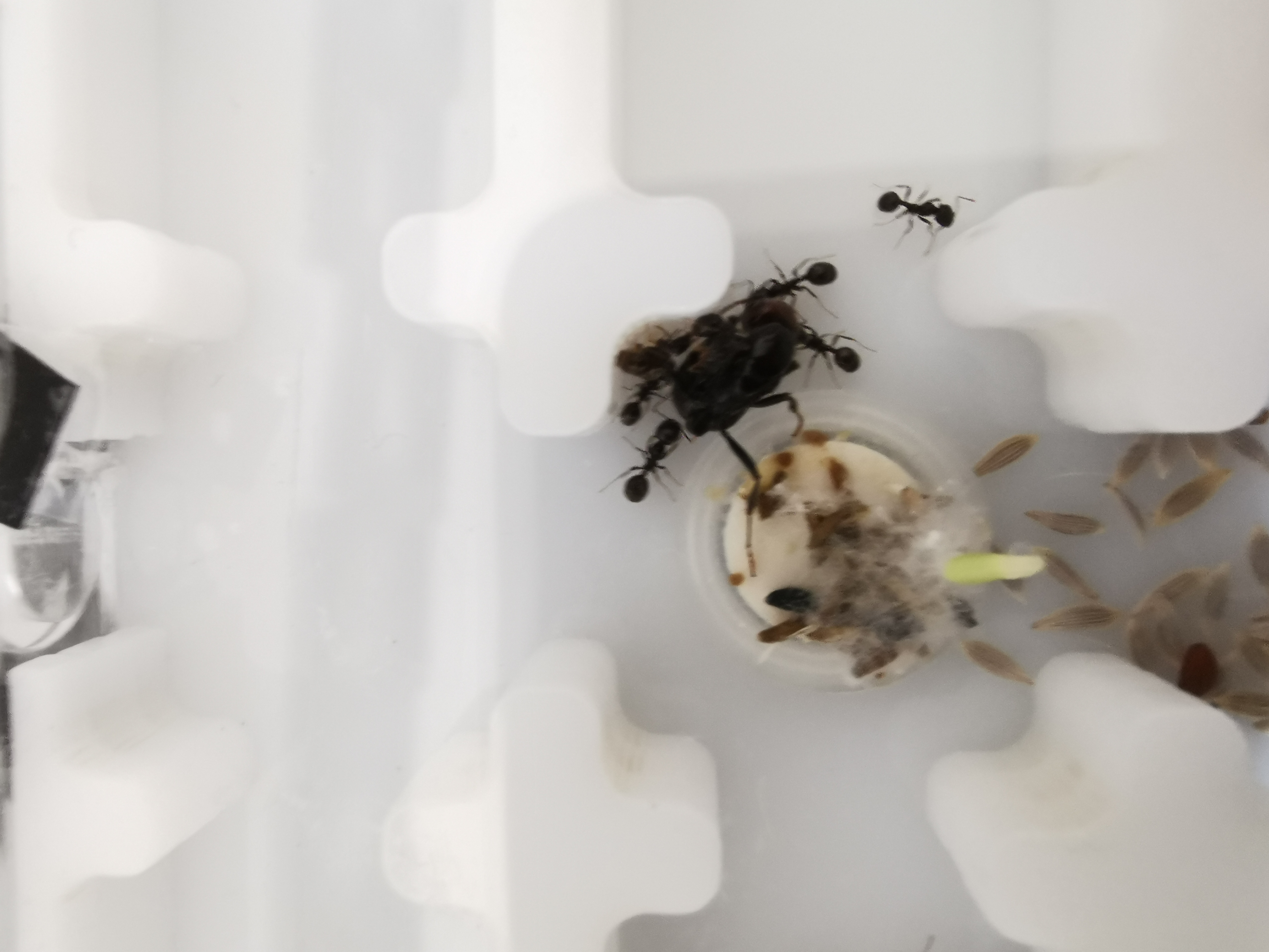 Ich habe gerade am Anfang wenn die Kolonie noch klein ist immer alles als Mischung durch eine PfeffermĂŒhle in einen flachen Napf gemahlen und diesen dann in der Arena positioniert.