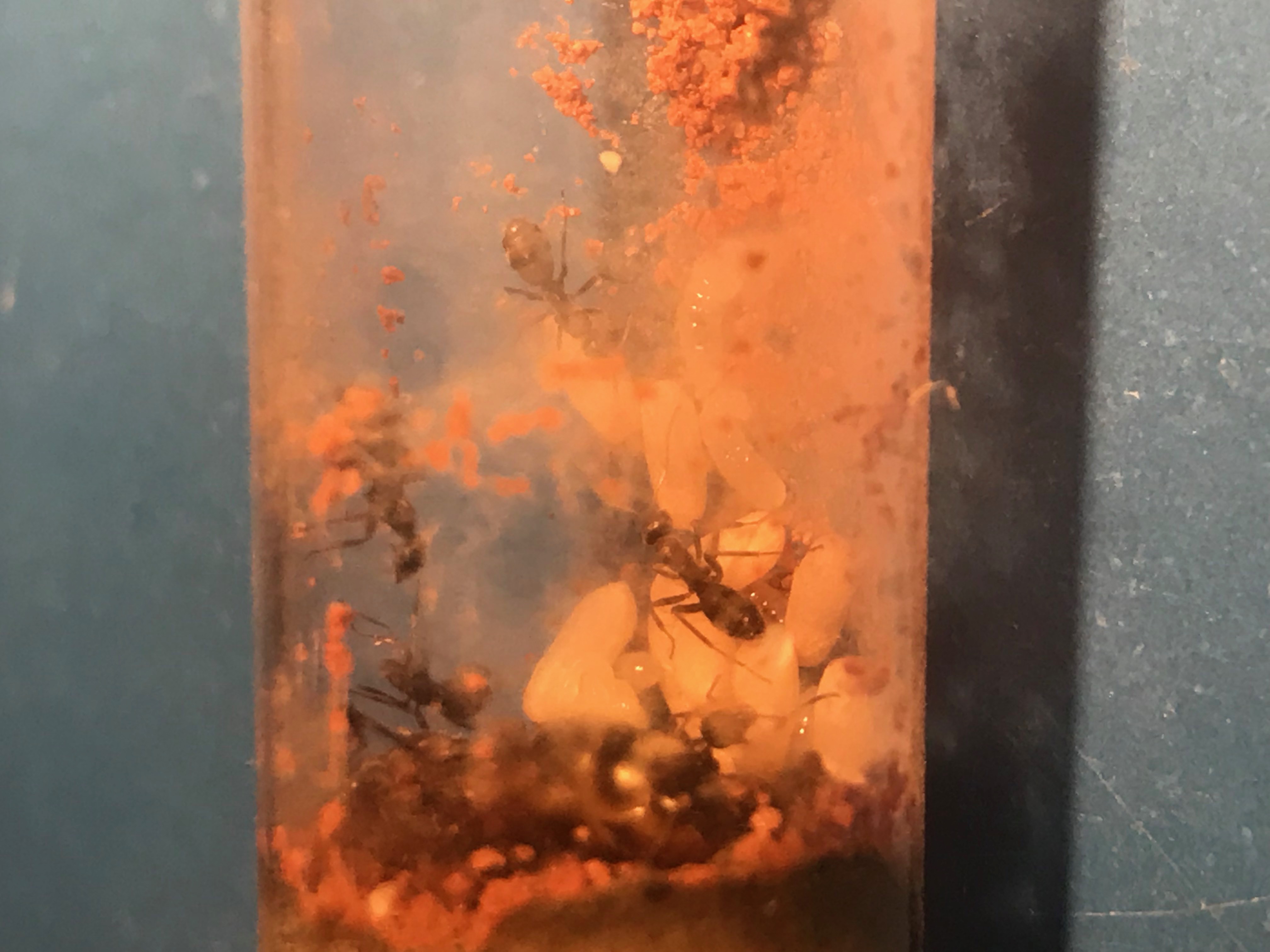 Königin im abgedunkekten Reagenzglas in eine kleine Plastebox als Arena gelegt und einen kleinen Strohhalm durch die Watte geschoben. Auf einem kleinen Stein habe ich einen kleinen Tropfen Honig angeboten so das die ersten Arbeiterinnen sich mit ein paar Kohlenhydraten versorgen können. Dieser wurde von der Pflegeperson meiner anderen Ameisen und Haustiere einmal wöchentlich gewechselt.