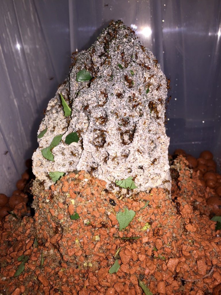 Da sie nach Entfernen der Pilzhaube gestern Früh weiter fleißig am ehemaligen Eingang zur Pilzabdeckung rumgebastelt hatten - das war ein Haufen aus Seramissteinchen und Sand mit Eingangsloch - hatte ich mich abends dazu entschlossen, diesen zu zerstören. Das Material habe ich zum Pilzbeckeneingang geschoben und diesen damit halb verschlossen in der Hoffnung, dass sie so schlau sind den dann zuzumachen und dort ihren Eingang zu bauen und pflegen.