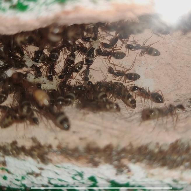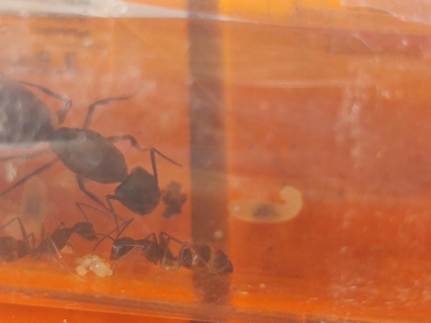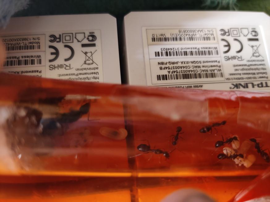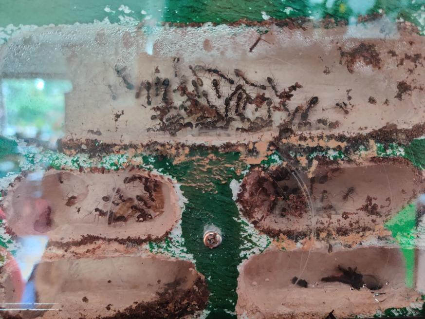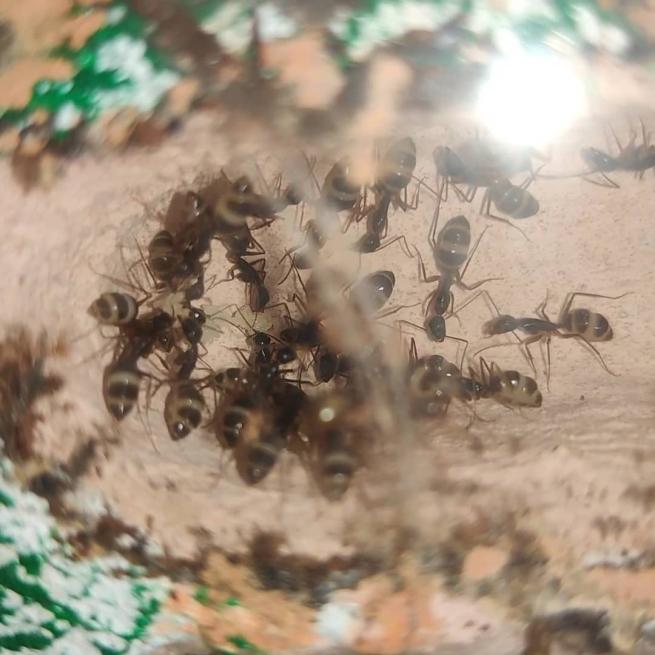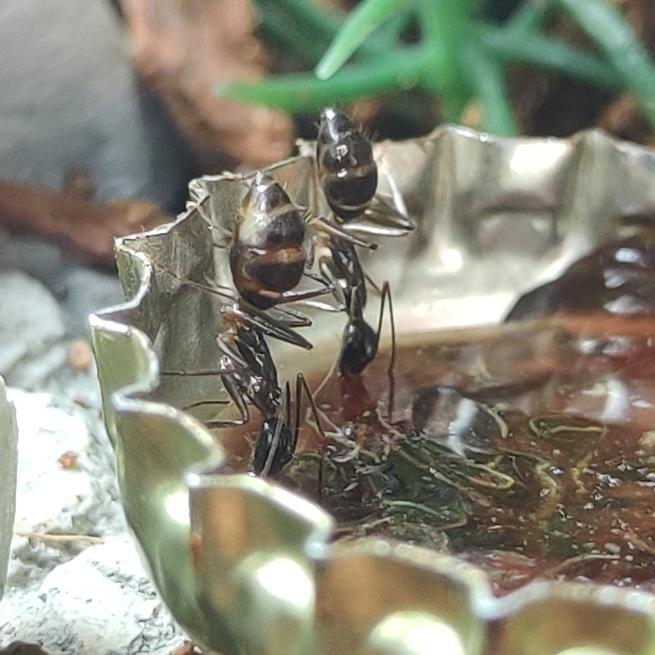 Man konnte gut die Rekrutierung beobachten, eine lief ins Nest und immer mehr kamen heraus, sogar die Majore! Die Beute wurde an allen Seiten fixiert und getötet. Ansonsten sind sie bisher aber noch ziemlich ängstlich, wird der Deckel geöffnet oder ähnliches verstecken sie sich und/oder flüchten ins Nest. Sie scheinen auch nicht gerne auf dem Boden herumzulaufen. Momentan nutzen sie lieber die Wege über die Steine oder die Wand.