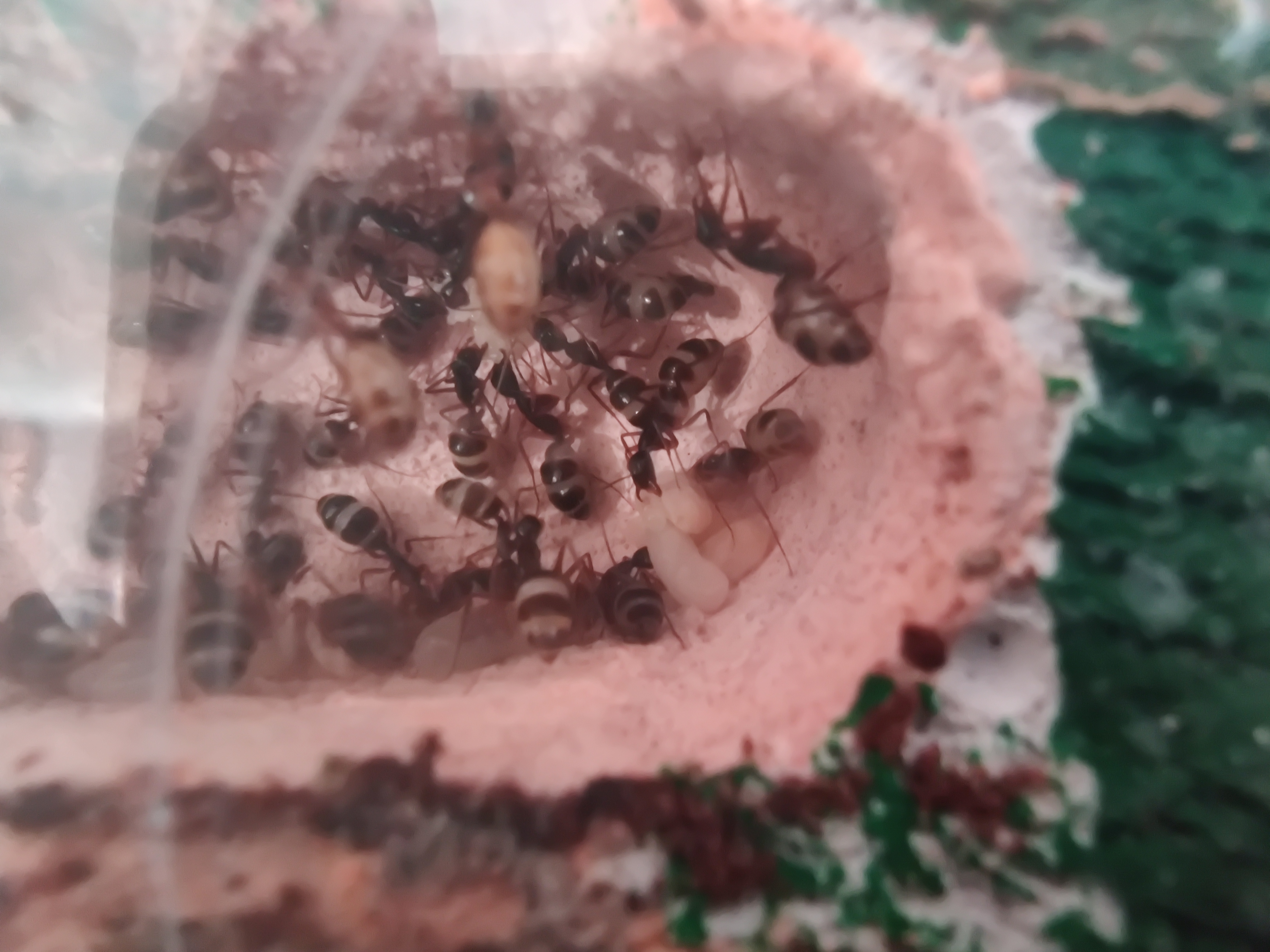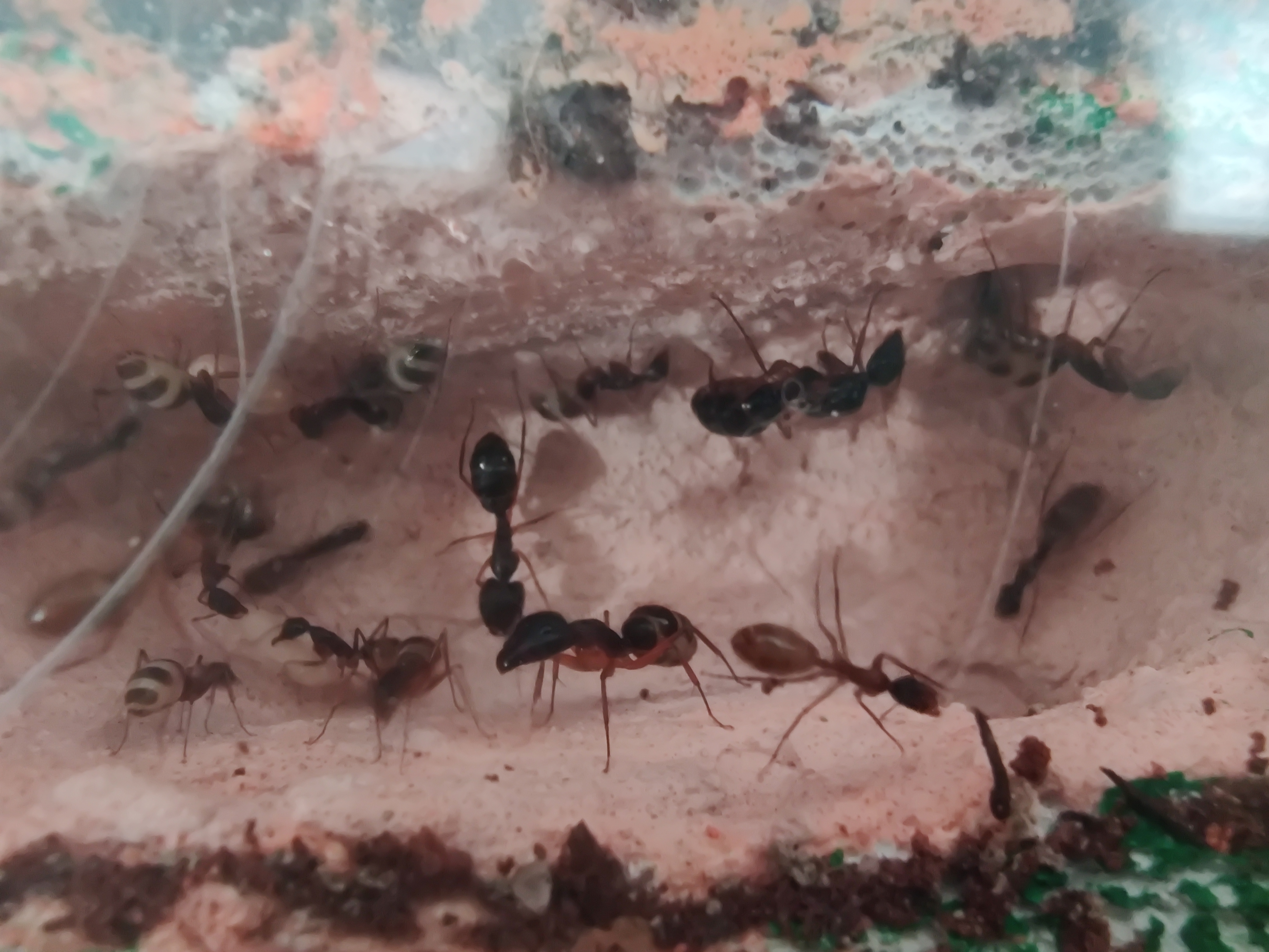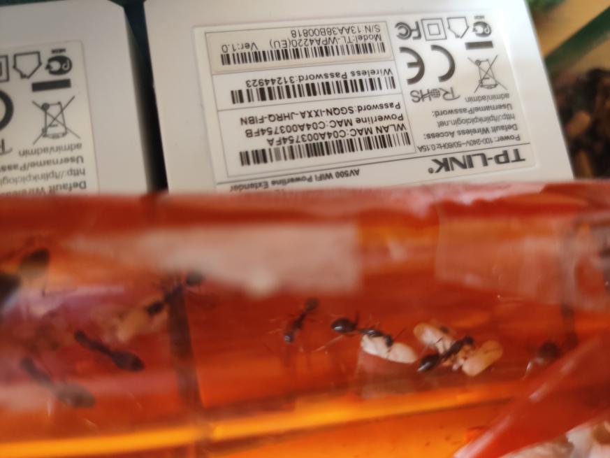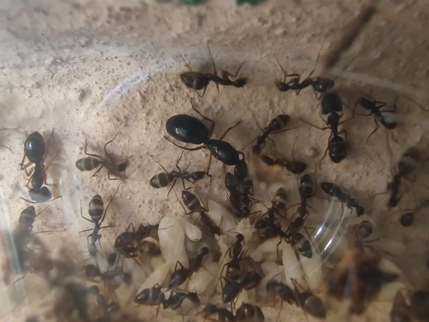 Man konnte gut die Rekrutierung beobachten, eine lief ins Nest und immer mehr kamen heraus, sogar die Majore! Die Beute wurde an allen Seiten fixiert und getötet. Ansonsten sind sie bisher aber noch ziemlich ängstlich, wird der Deckel geöffnet oder ähnliches verstecken sie sich und/oder flüchten ins Nest. Sie scheinen auch nicht gerne auf dem Boden herumzulaufen. Momentan nutzen sie lieber die Wege über die Steine oder die Wand.