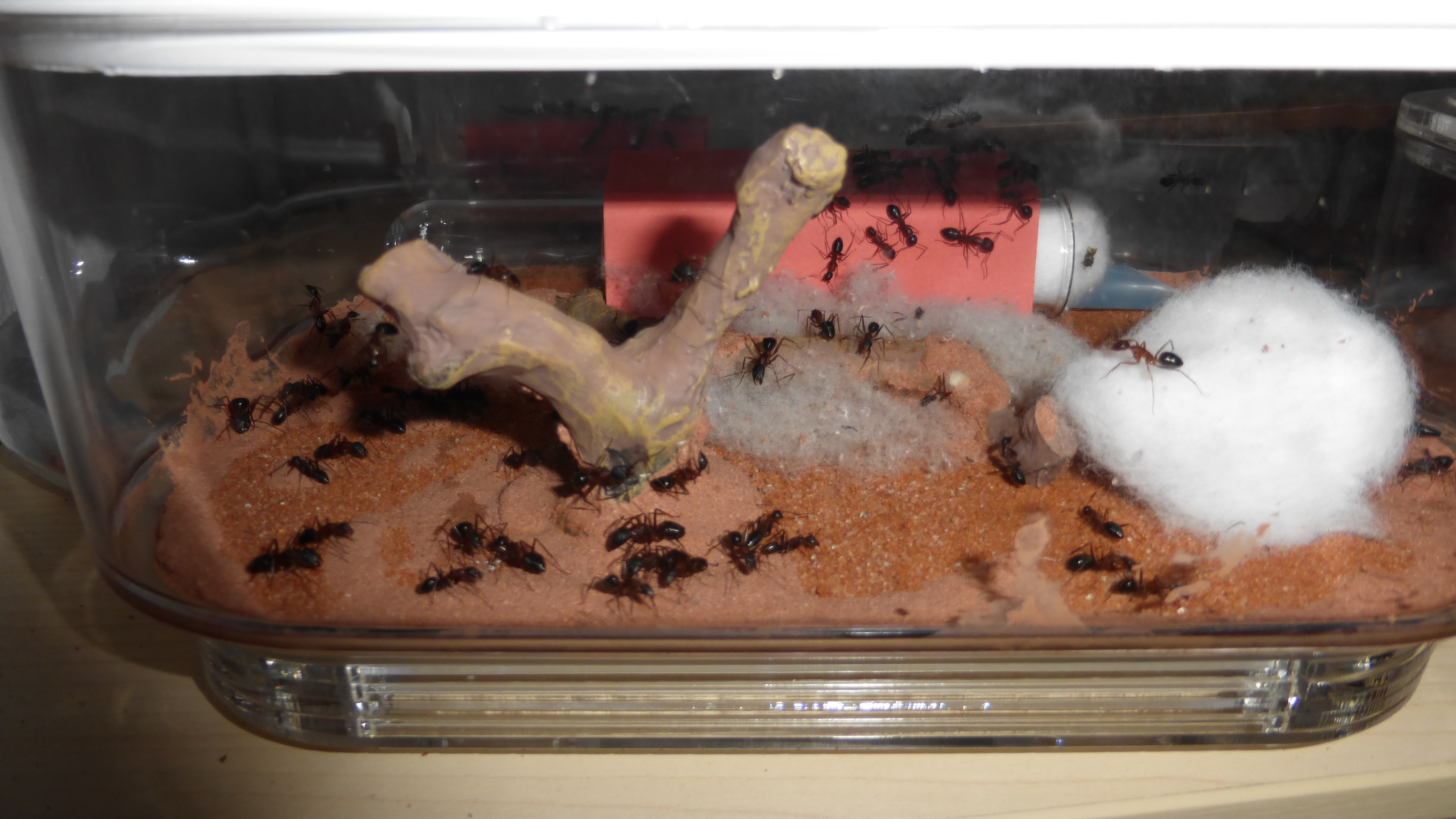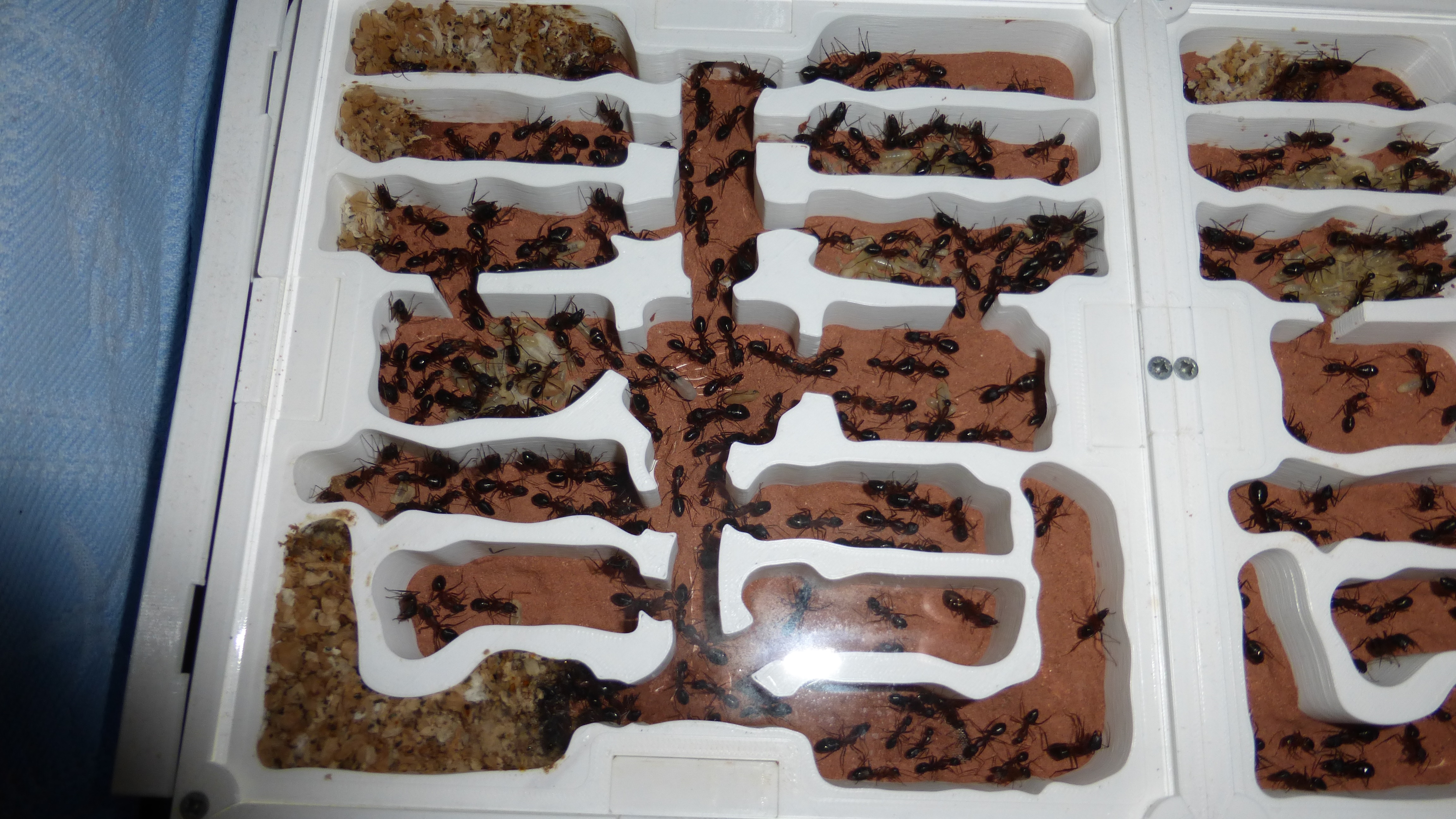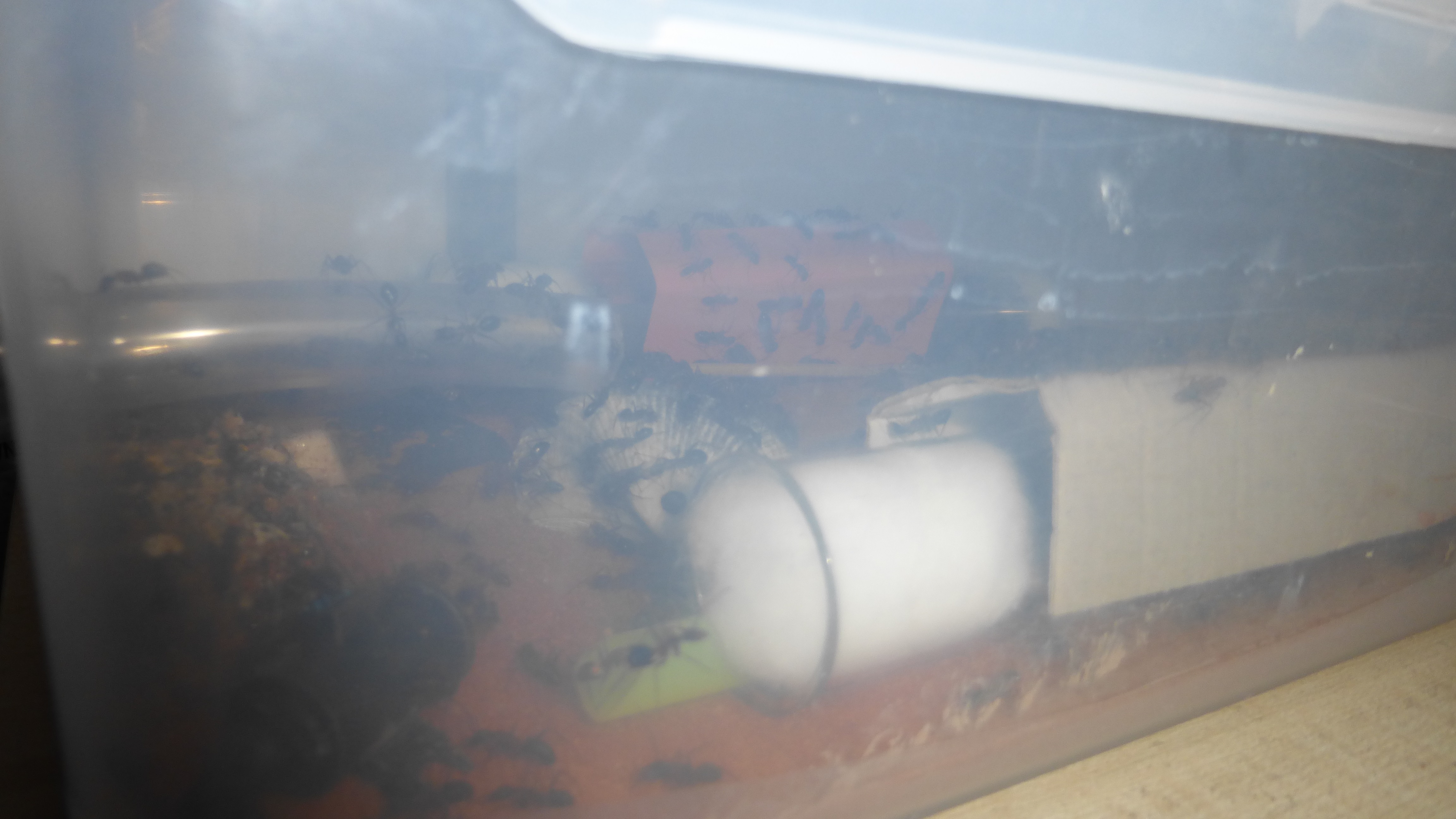 Brut in der "Ende der Welt"-Box, wenn man bedenkt, dass ich noch nie gesehen habe wie sie Eier dorthin tragen. Bei Camponotus werden die Arbeiterinnen ja vom Eierlegen abgehalten, wenn sie regelmäßig in Kontakt mit Eiern der