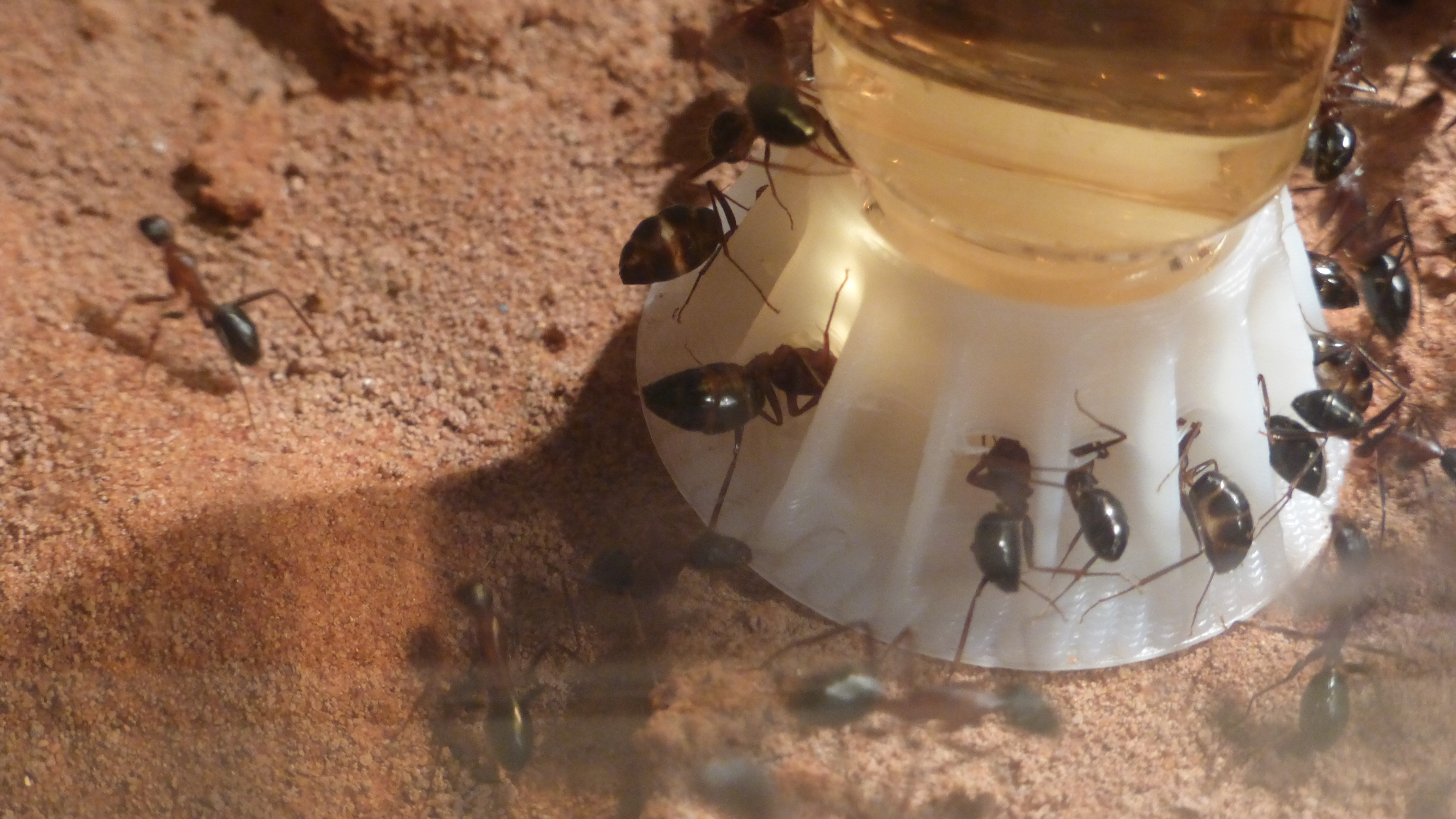 Ameisen auf der frisch befüllten Tränke (byformica feeder 16ml, verdünnter Ahornsirup mit Traubenzucker).