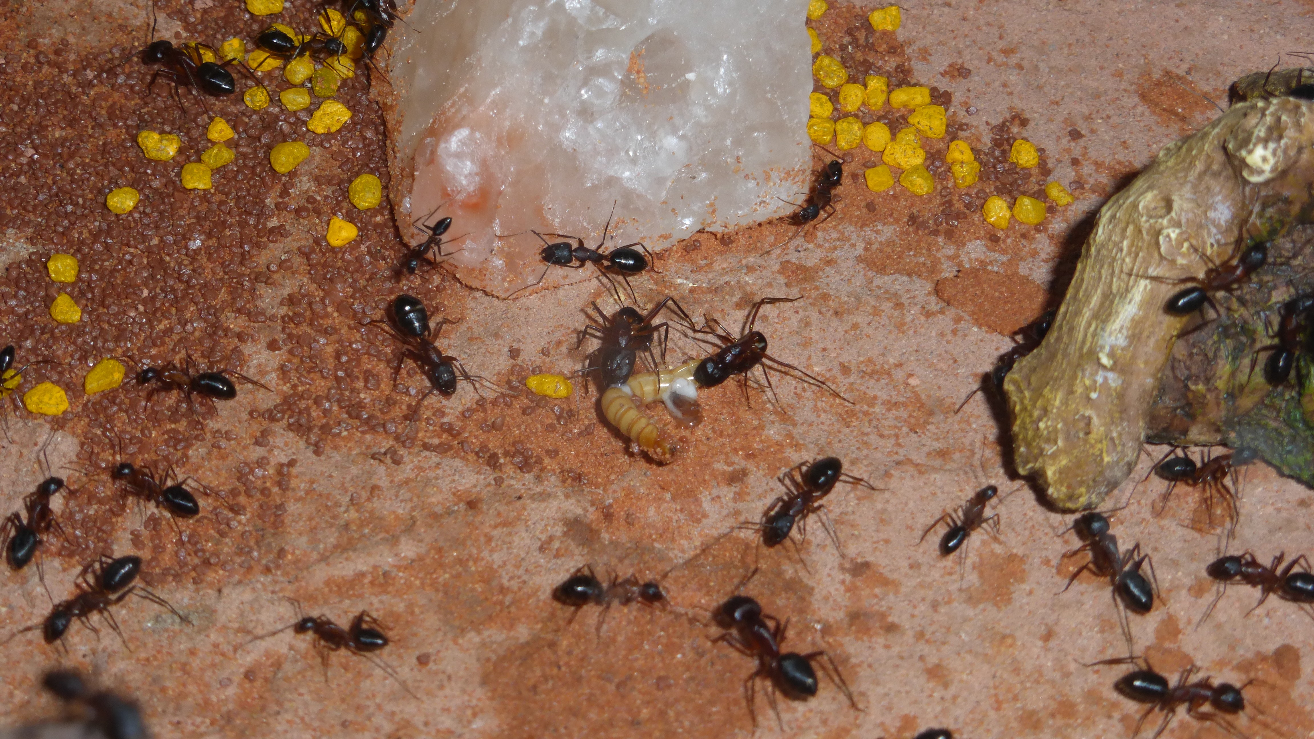 Aus irgendeinem Grund kristallisiert der Zucker an den Öffnungen der Tränken aus und die Ameisen verteilen das Zeug in der Arena.