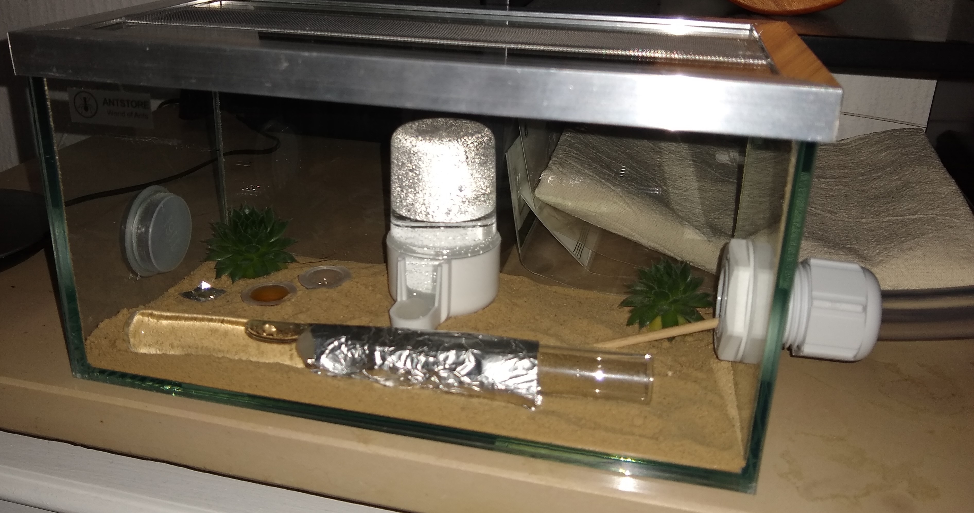 Das neue Reagenzglasnest liegt nun in der Arena, welche über einen ca. 20 cm Schlauch mit der Farm verbunden ist und auch auf besagtem Regal steht. In der Arena biete ich auch Wasser, Honig und Zuckerwasser an.