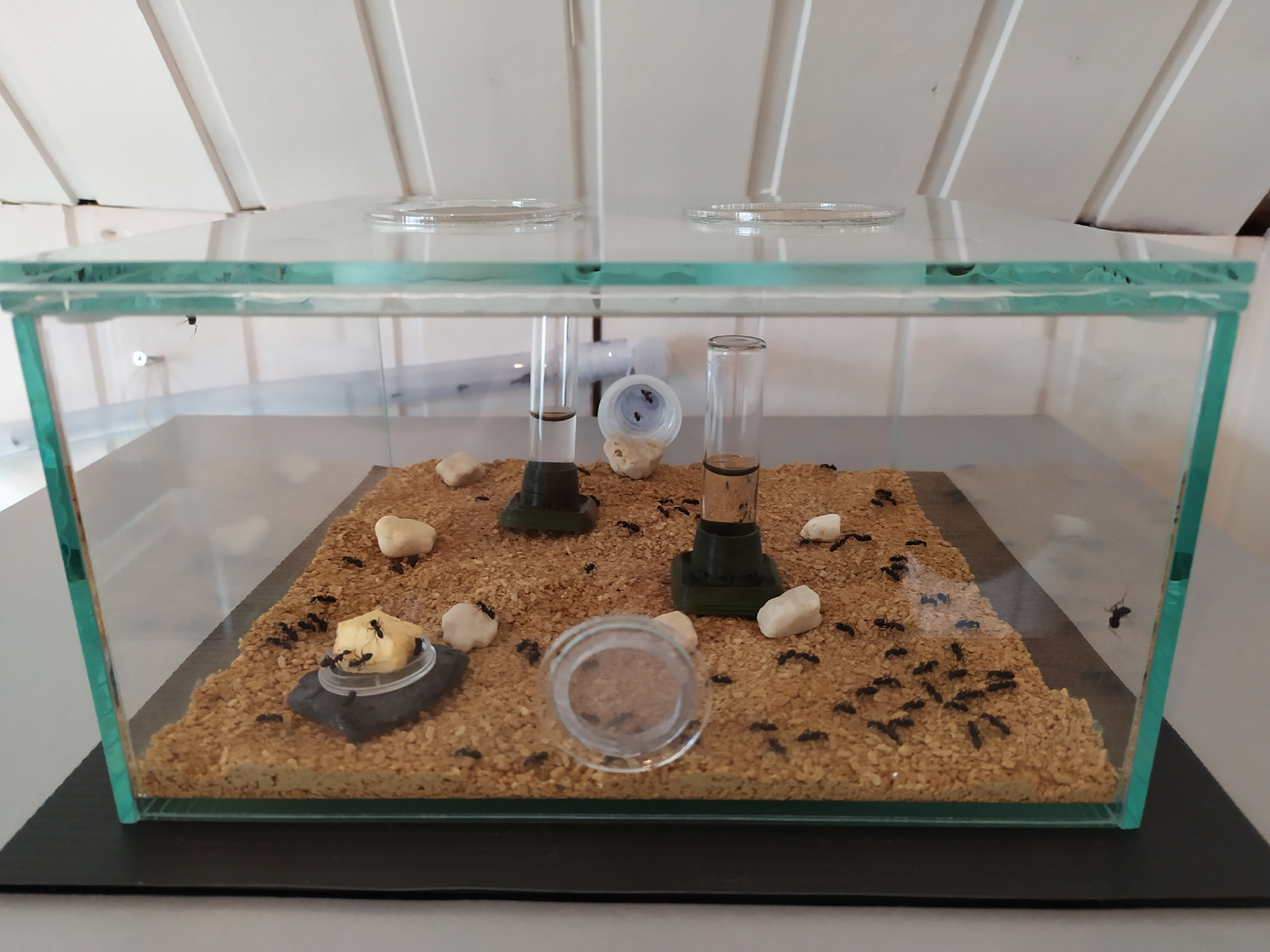 15.9.2018 Ich habe als weitere Nestmöglichkeit eine 30x20 Ameisenfarm mit Gipsnest angeschlossen. Das Gipsnest habe ich mit Sand/Lehm ausgestrichen. Die ersten Arbeiterinnen sind kurze Zeit später bereits ohne Brut eingezogen.