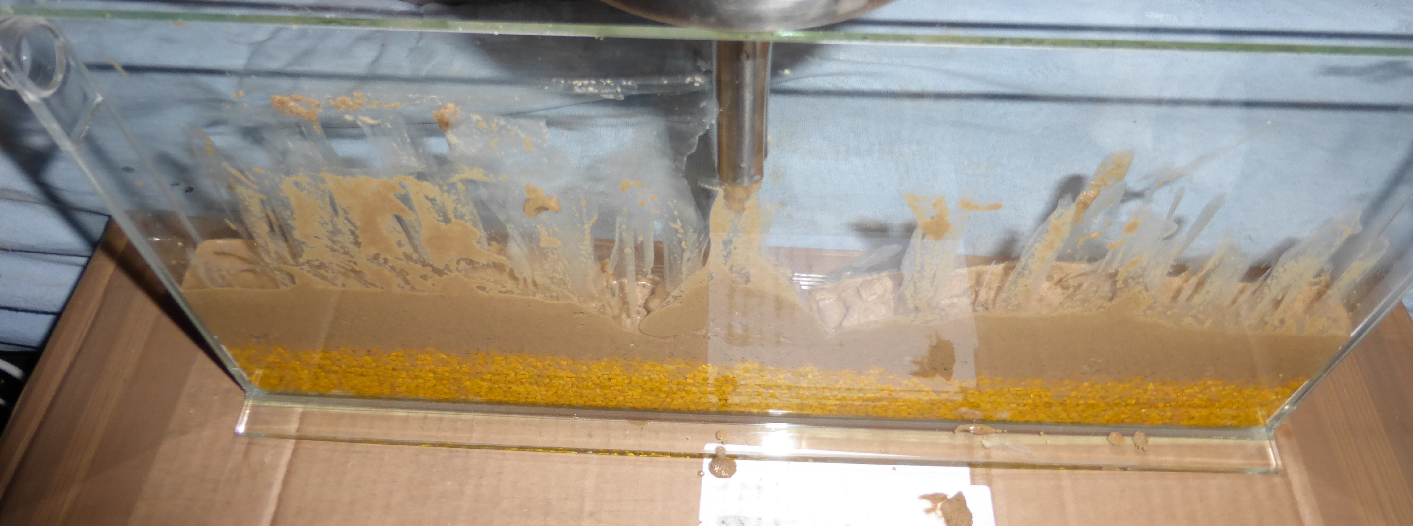 Es sind gelbe Aquariumsteinchen als Drainageschicht.