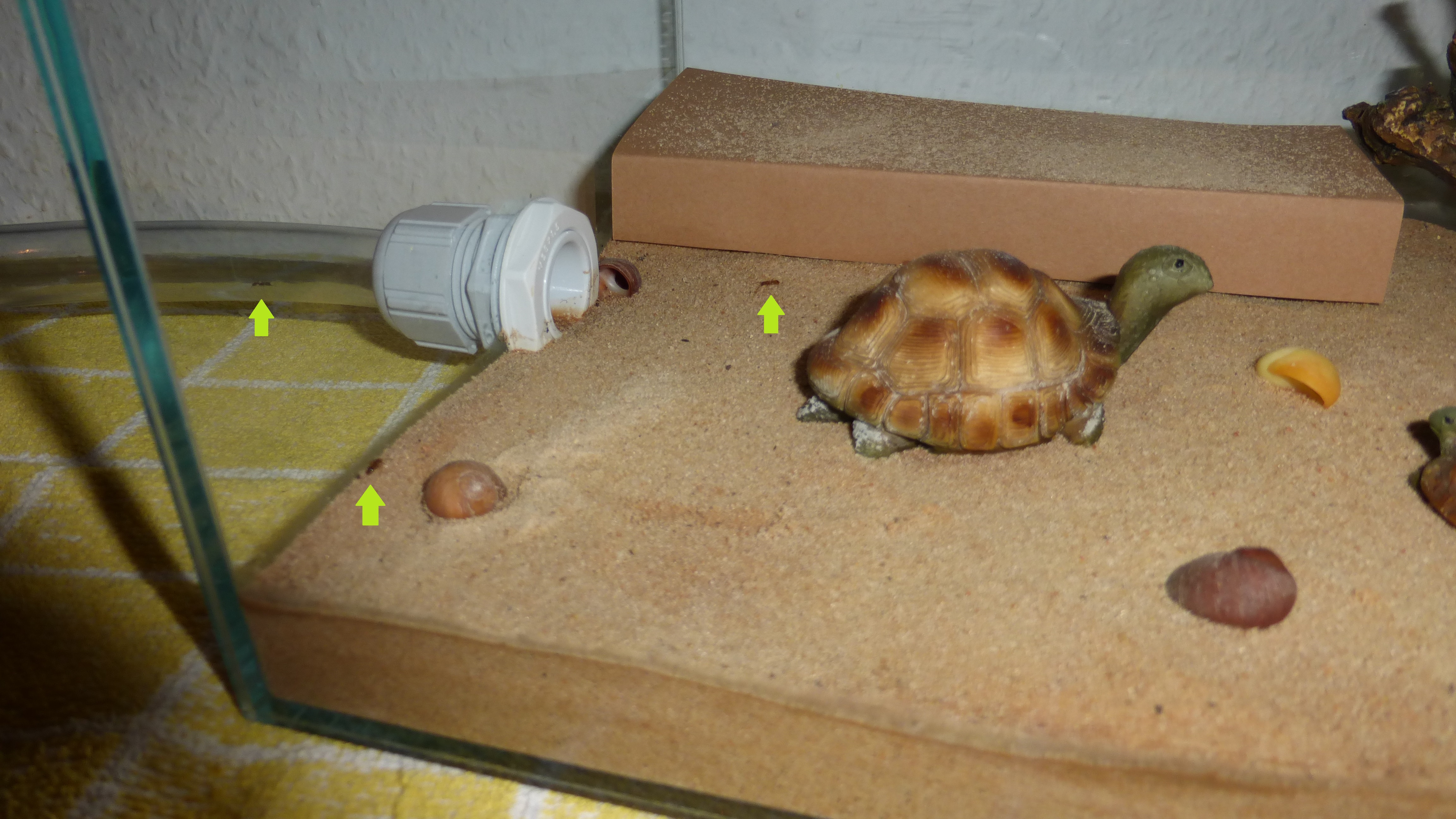Als Dekoration hab ich ein paar Muschelschalen, Schneckenhäuser und eine Art Kunstbaum/Wurzelstück aus Resin benutzt, sowie ein paar alte Schildkrötenfiguren, die in der Dose lagen, in der die Muschelschalen waren.
