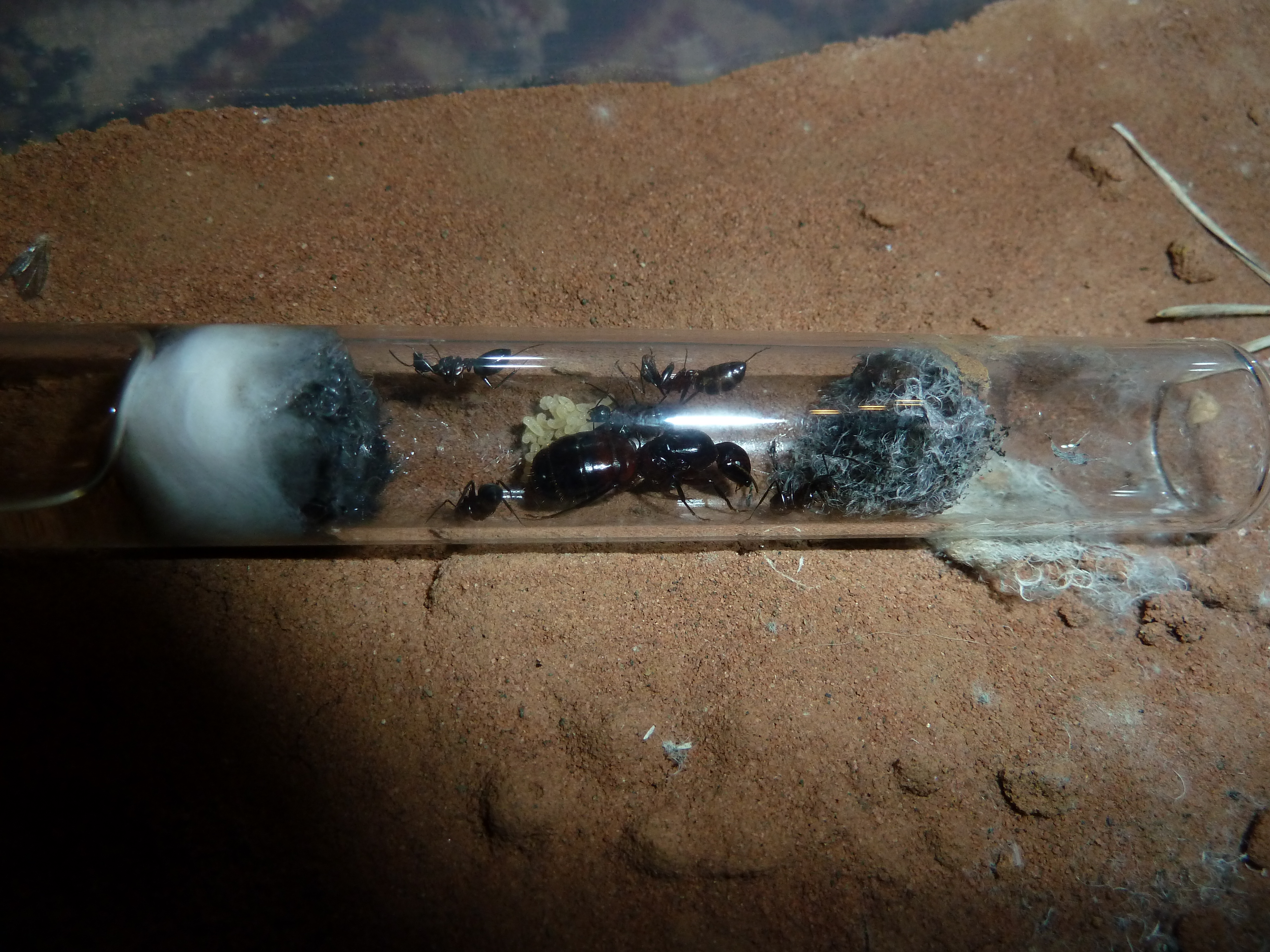 Jetzt sind sie wieder oben auf dem Schrank und können in aller Ruhe ihr neues Zuhause erkunden. Wenn alles glatt läuft, bekommen sie nächstes Jahr ihr eigenes Formicarium mit externem Nest. Mal sehen, ob die neuen Eier, welche die Gyne vor kurzem gelegt hat, noch dieses Jahr zu Arbeiterinnen werden.