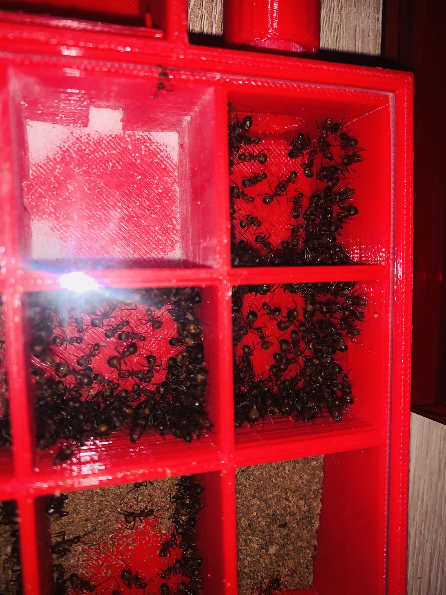 1. meine Camponotus nicobarensis haben nun in dem selbstgedruckten Nest auch Brut reingetragen, das ist in der Nacht von gestern auf heute passiert! In einer Kammer ist nun sehr viel Brut, in der anderen nur wenig!