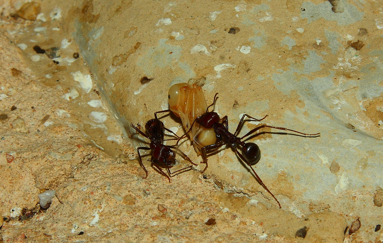 Nachdem sie diese bis ins Nest gezogen haben, geht es daran diese zu zerlegen, um diese in kleinen StĂĽcken als Futter an ihreLarven zu legen.