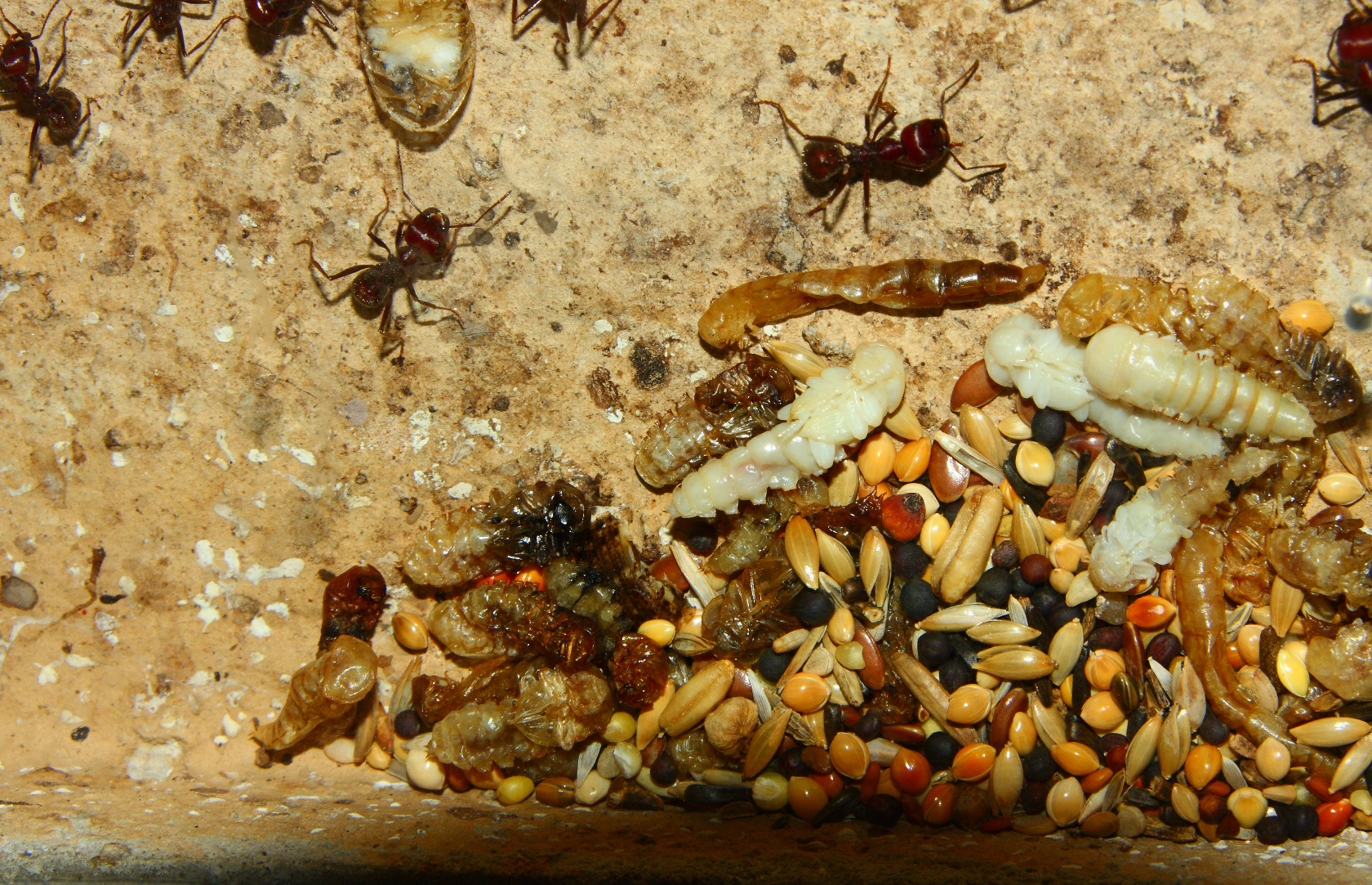 Messor cephalotes machen keinen Unterschied bei ihrer Lagerlogistik, alles was nicht gleich verwertet wird, deponieren sie.
