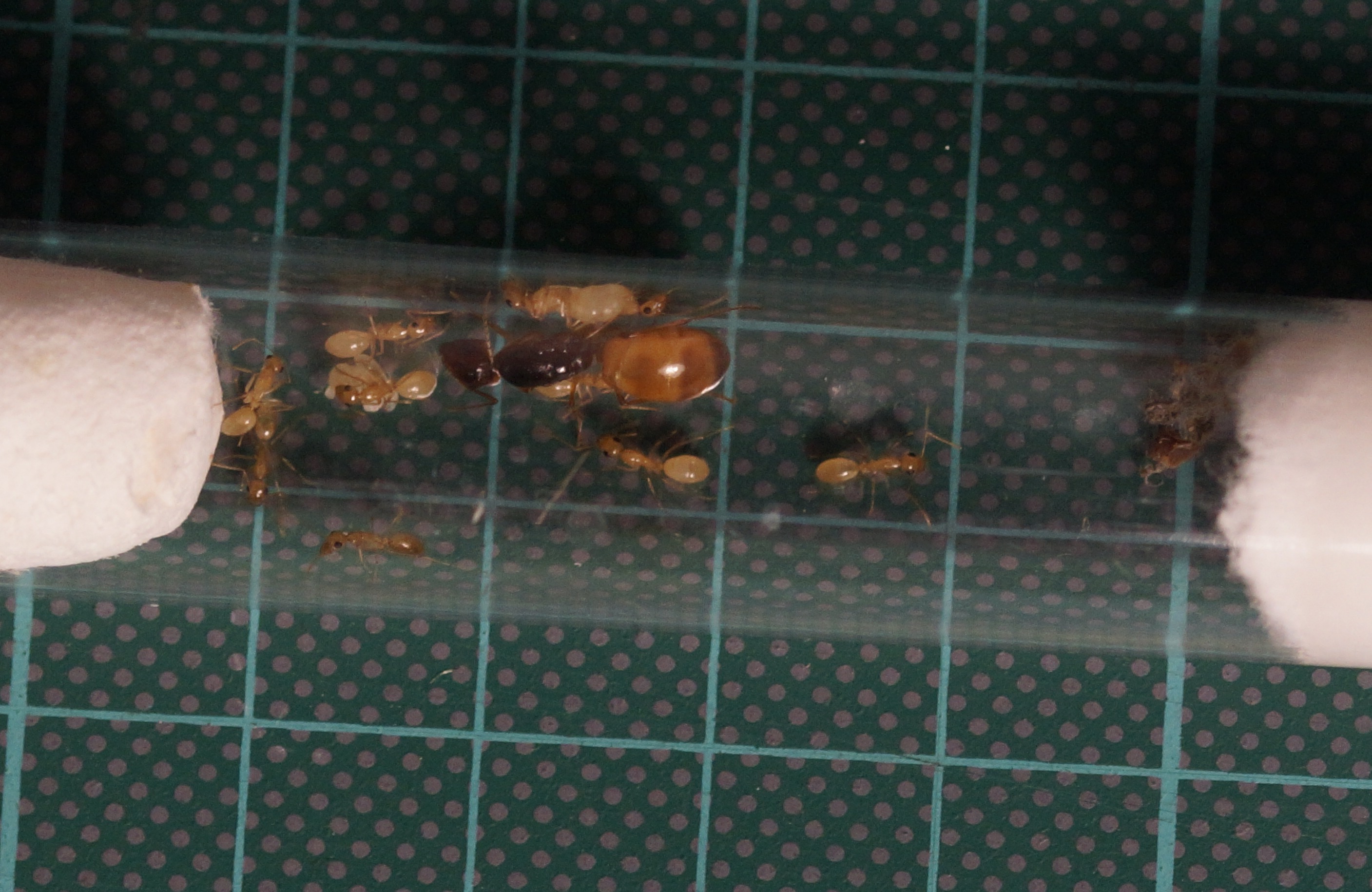Ja, Manticor79, ich habe Aufnahmen aus der Anfangszeit. Mal sehen, ob's die Aufnahme bringt: Gyne mit Pygmäinnen und etwas Brut. Die Quadrate haben 10 mm Kantenlänge. Die Gyne hat also zirka 12 mm, die Pygmäinnen sind >/= 4 mm.