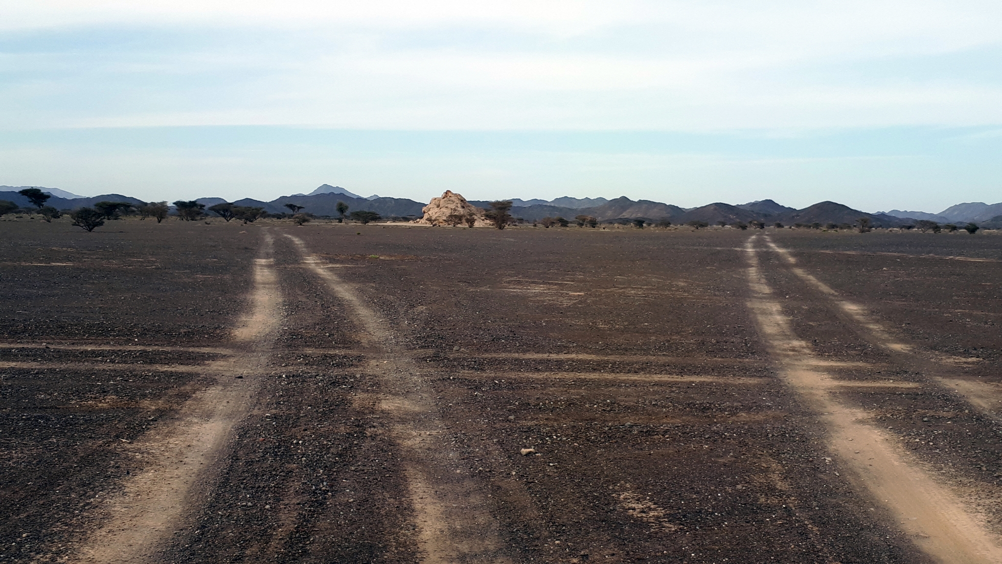 Das ist auf jeden Fall auch was, was ganz anders läuft als hier: man will irgendwo hin, die Straße wäre ein Umweg? Egal, querfeldein geht immer! Und wenn keine Piste da ist, werden Leute unseren Spuren folgen und irgendwann gibt es eine ;) Das Bild zeigt solche Pisten und im Vordergrund eine behelfsmäßige Moschee in der Nähe von Tierverschlägen, damit man auch, wenn man die Tiere umsorgt, immer rechtzeitig zum Beten kommt.