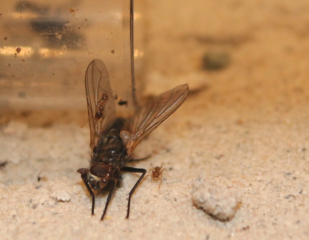 So aus einem Meter Abstand sieht das witzig aus. Die tote Fliege läuft seitlich, rückwärts ins Reagenzglas