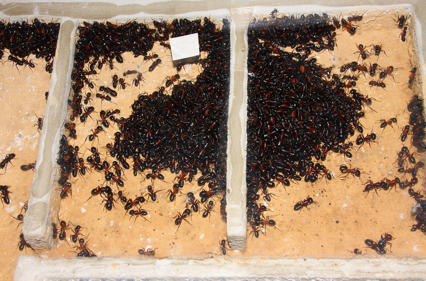 Dort wo das Klebebandstück sichtbar ist, habe ich ein Loch gebohrt und die Königin eingesetzt, mitten rein in den Ameisenpulk.