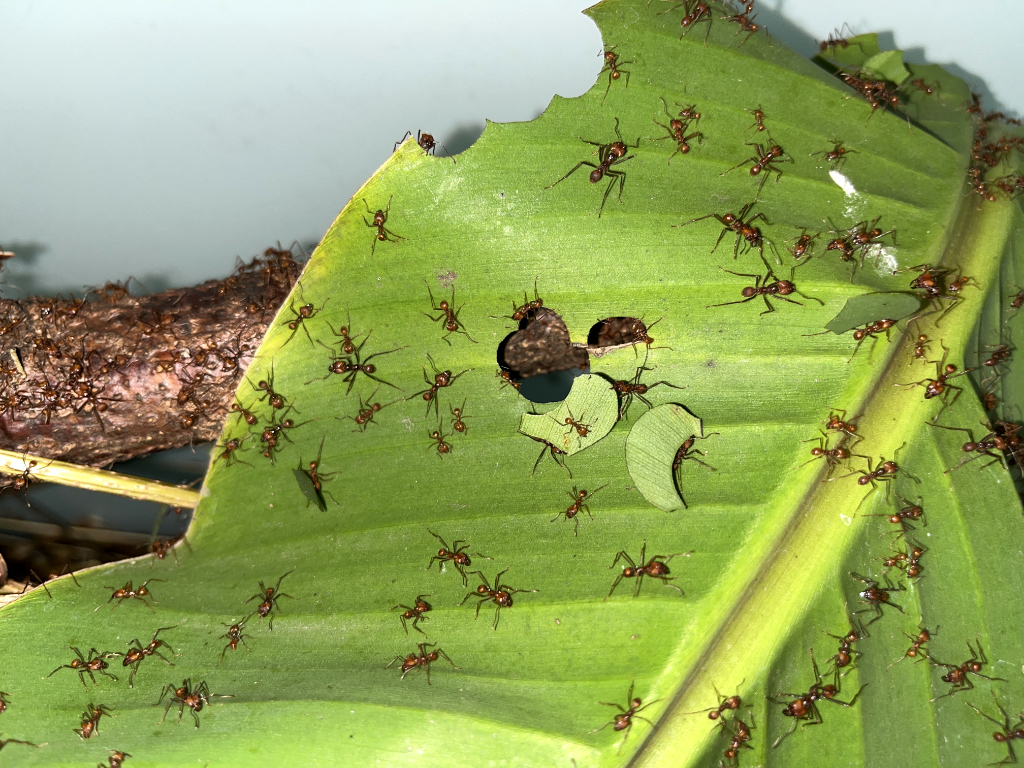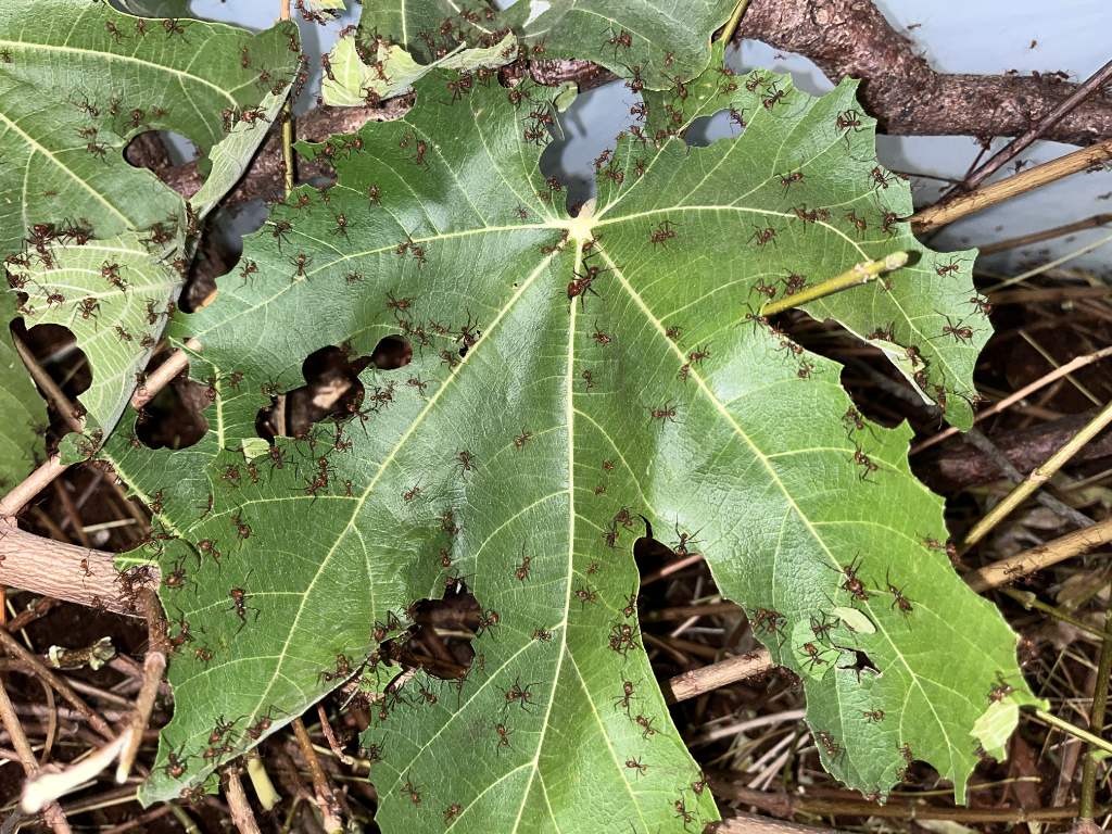 Hier sollte erwĂ€hnt werden, dass gerade kleine Kolonien am Anfang noch recht wĂ€hlerisch sind bzw. sein können. Und unterschiedliche Kolonien unterschiedliche âGeschmĂ€ckerâ haben können â das was die eine Kolonie gerne und willig schneidet, wird von der anderen ignoriert. Meine Atta cephalotes Kolonie hat z.B. lange Zeit RosenblĂŒtenblĂ€tter so gut wie komplett verschmĂ€ht, obwohl diese als Lieblingsfutter von Blattschneiderameisen gelten. Ab ca. einem Liter Pilz wird das besser, sprich wenn sie langsam mehr Futter brauchen, nehmen sie auch mehr verschiedene Pflanzen. Was auch logisch ist: Neue Futterpflanzen bergen das Risiko, dass der Pilz sie nicht mag oder vertrĂ€gt. Also erst Mal bei bisher bewĂ€hrtem bleiben, spĂ€ter bei höherem Bedarf probieren sie dann neue Pflanzen. Die Ameisen âentscheidenâ zusammen mit dem Pilz, ob das was sie schneiden vertrĂ€glich fĂŒr ihn ist. Pilz und Ameisen kommunizieren miteinander.