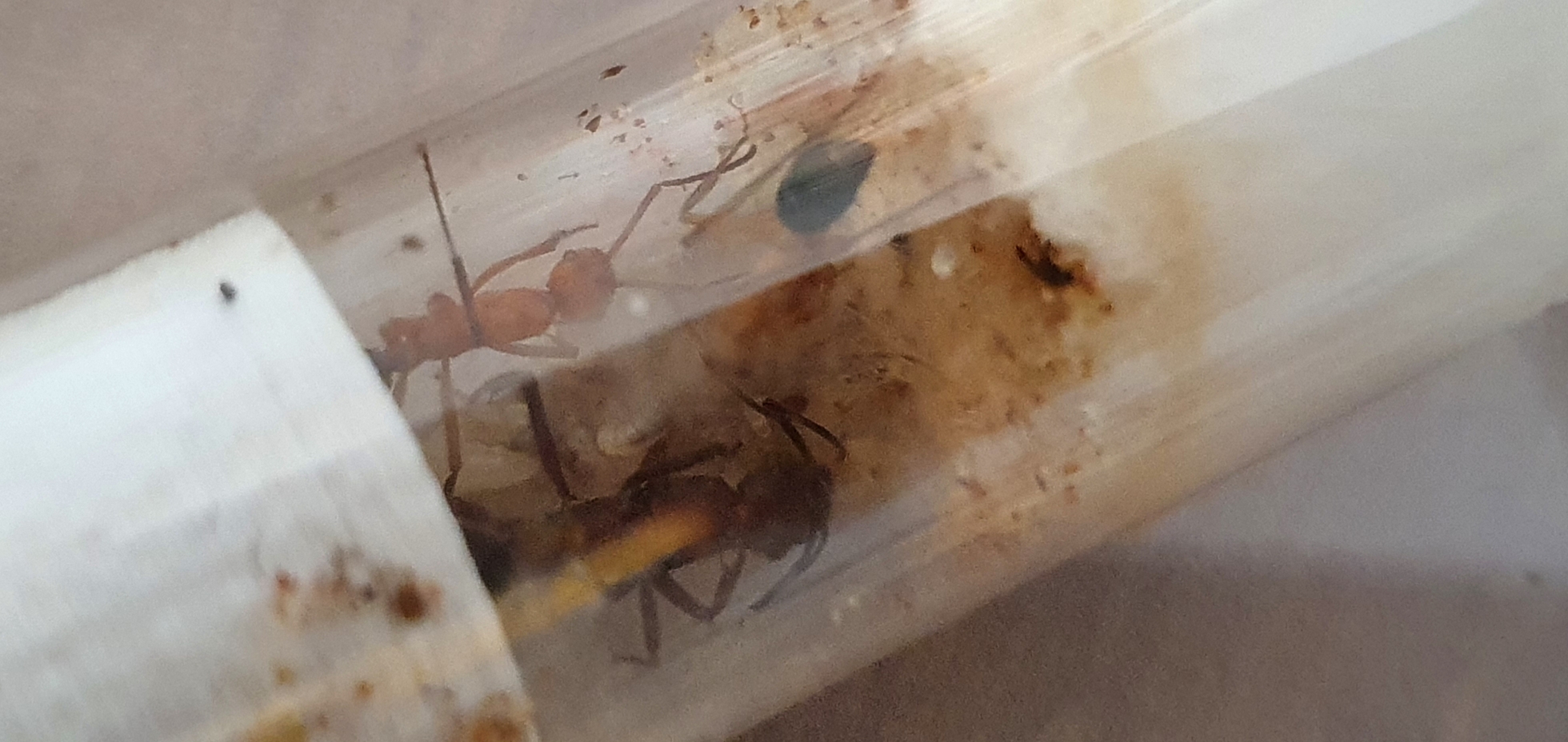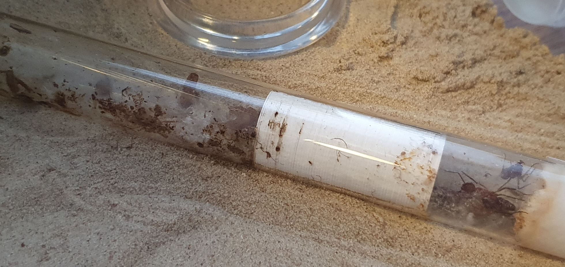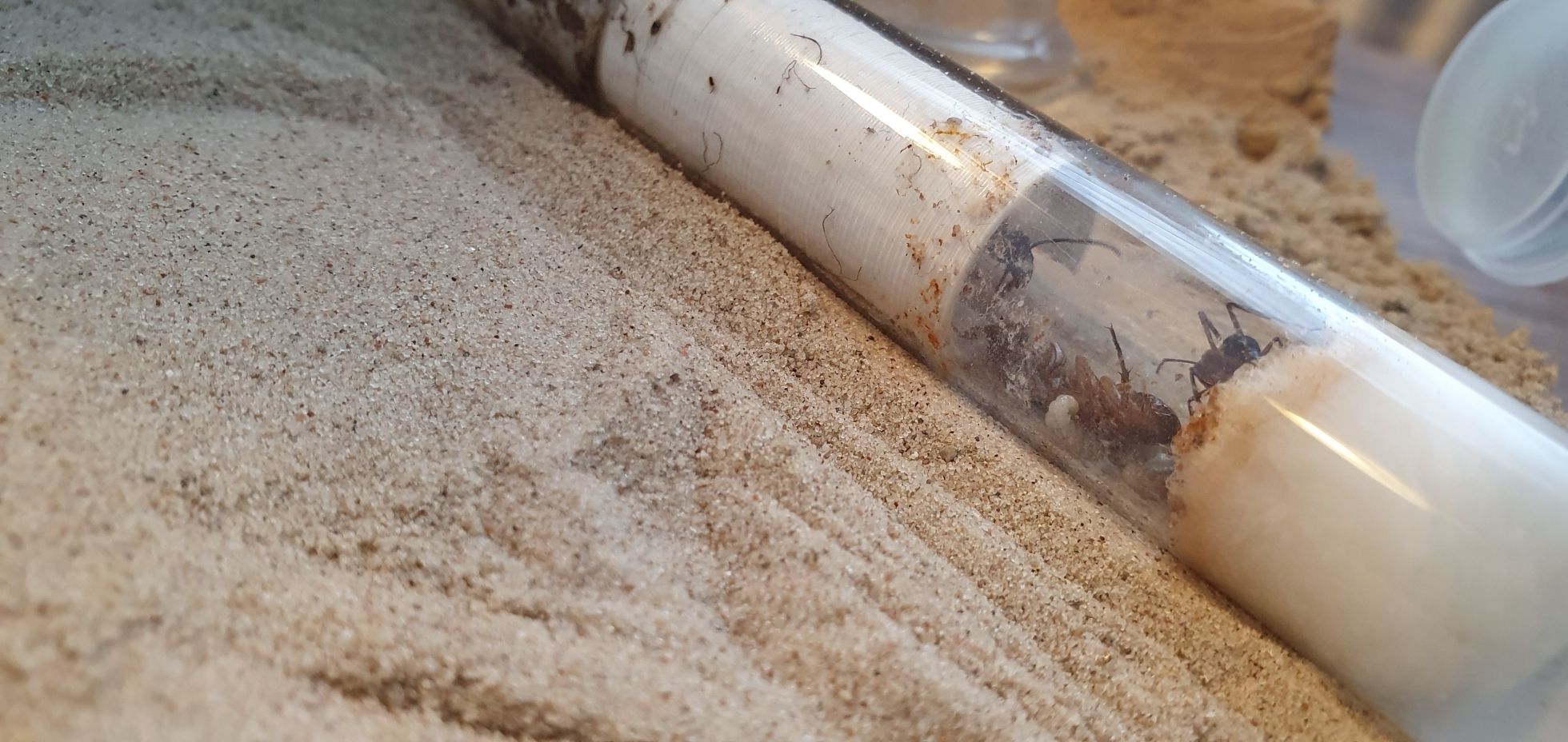 Was könnte man also besser oder anders machen? In einem anderen Bericht hatte ich gelesen, dass diese Art lieber in einer kleinen Sand-Lehm Mulde gründet. Das ganze dann mit einer Scheibe und Karton bedeckt und einen kleinen Ausgang freigelassen. Ich überlege ob ich an der Seite, wo die Heizmatte angebracht ist, auch so etwas anbieten sollte. Beziehungsweise den Nestbereich (hinten auf den Bildern) erwärme. Solange sie in ihrem Reagenzglas bleiben, scheint es Ihnen ja allerdings zu gefallen.