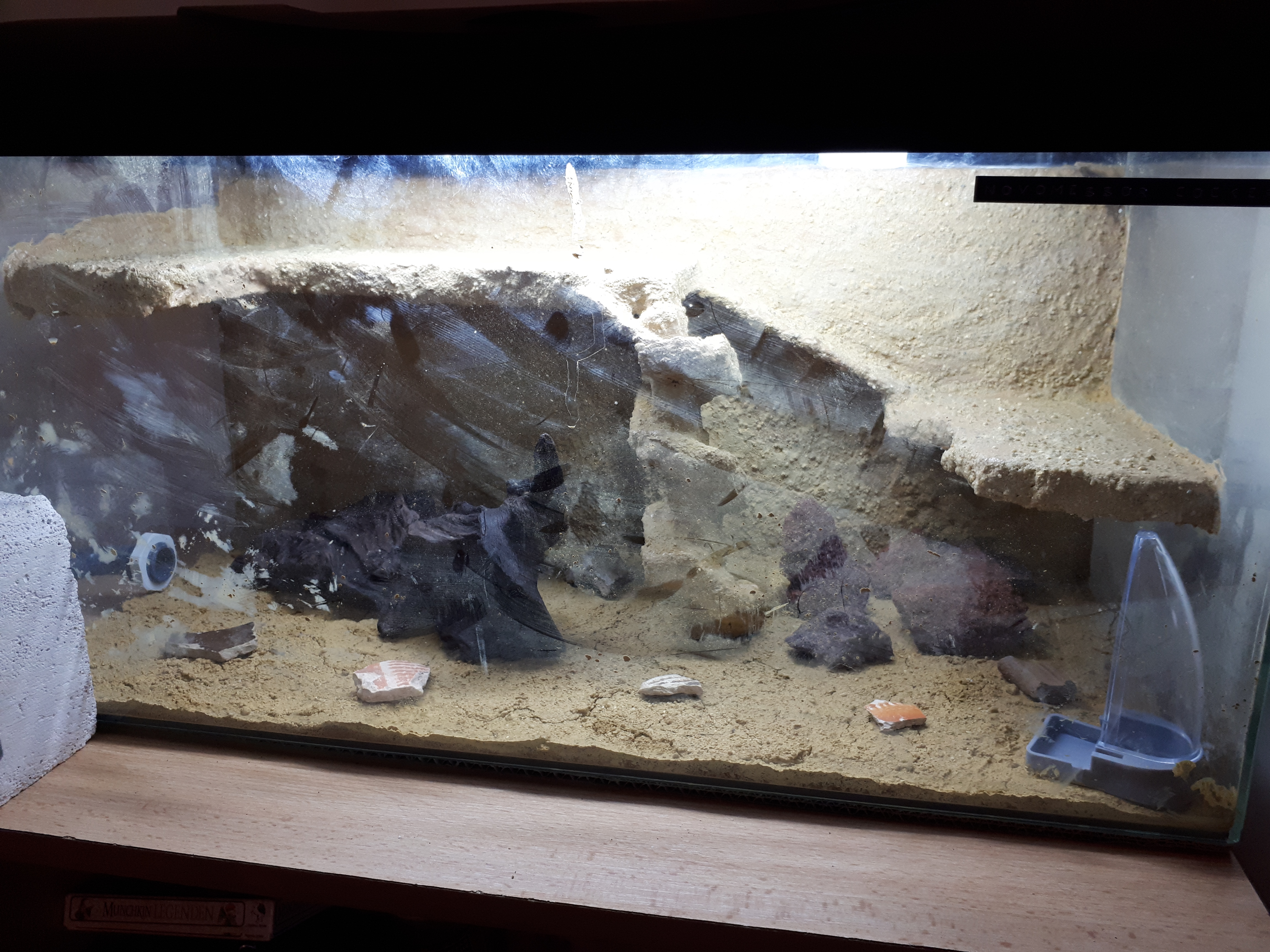 Jop, dann noch Deko rein - eine Aquarienwurzel, zwei Tillandsien, diverse Scherben von der Arbeit, Lavasteine und schon hat man eine ziemlich schöne Arena!