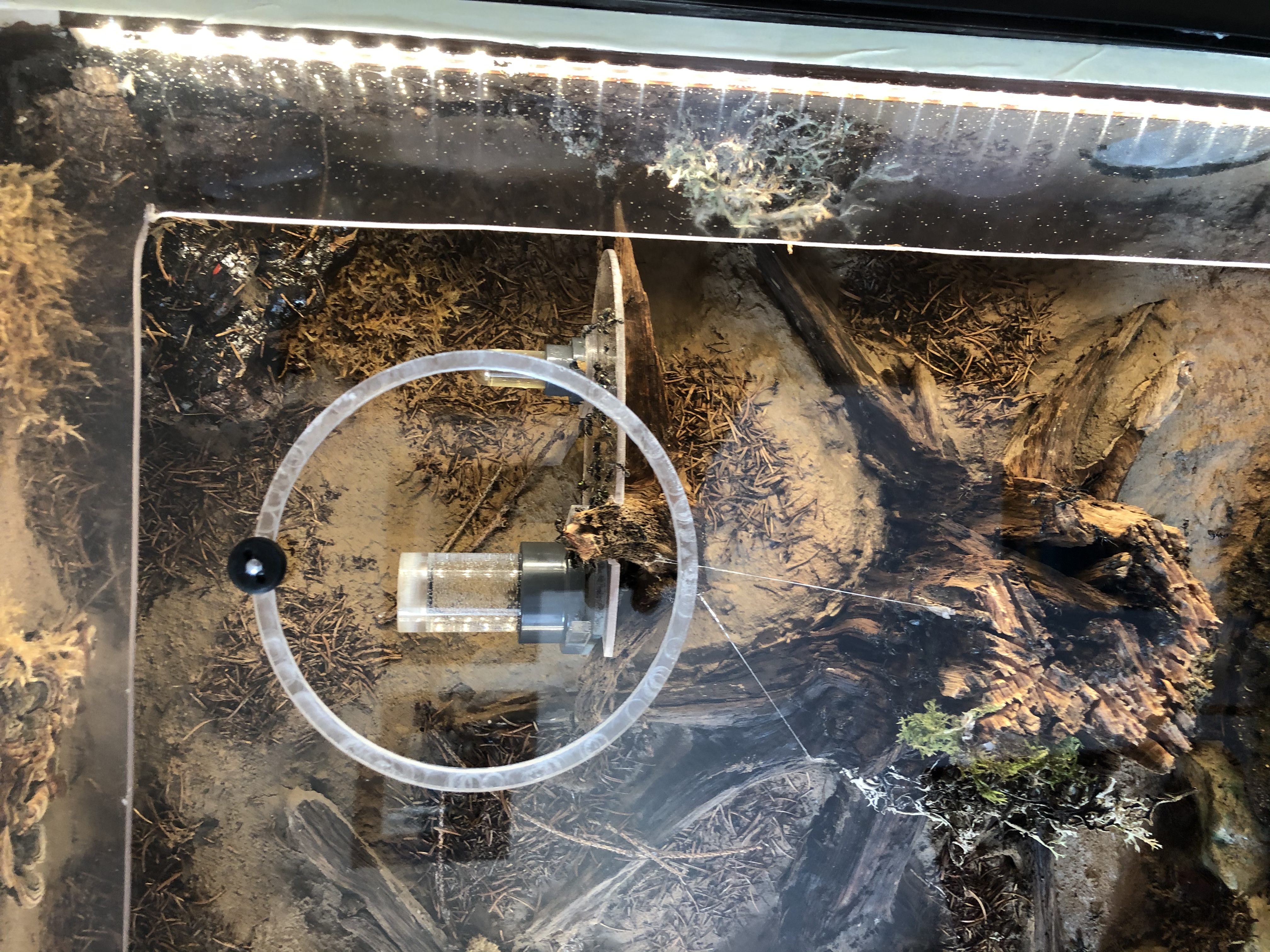 Dieser Rahmen ist mit Parafinöl benetzt und steht oben weiter nach innen als unten, damit abrutschende Ameisen nicht zwischen Frontplatte und Ausbruchrahmen landen. So die Theorie, in der Praxis zeigt sich dennoch eine gewisse Segelflugeigenschaft der Ameisen. Hin und wieder landet eine dazwischen. Sind die SeitenrÀnder griffig genug schaffen sie es meist nach oben und fallen irgendwann wieder ins Formikarium oder ich rette sie abends.