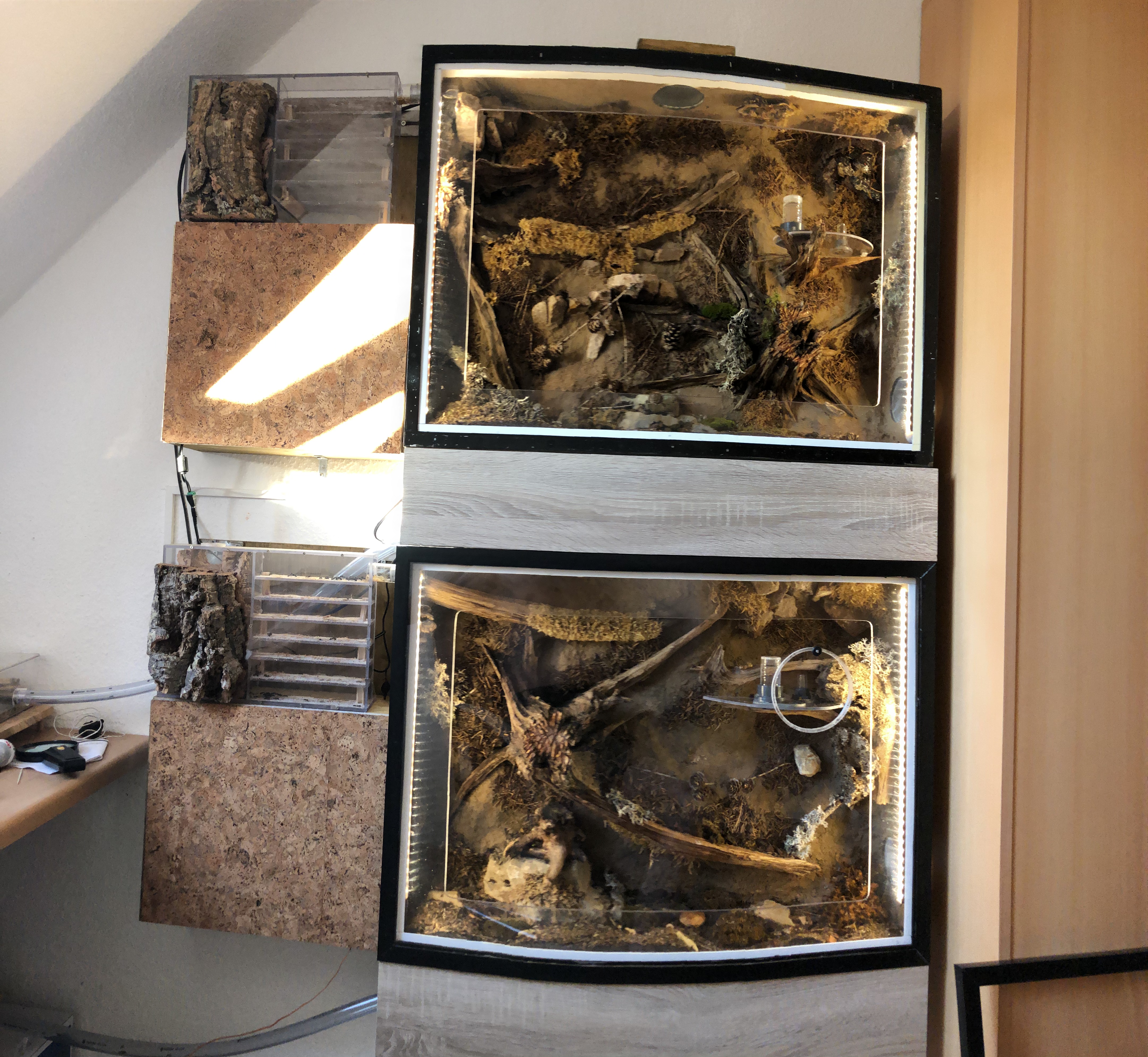 da bereits ein Forumsmitglied die Frage zum Platzmangel gestellt hat und welche technischen Lösungen es geben könnte, möchte ich hier mal meine Formikarien fĂŒr zwei C.Vagus Kolonien vorstellen. Die Formikarien befinden sich seit MĂ€rz noch im Experimentierstatus, also mit Pannen muss gerechnet werden. Bisher lief aber fast alles wie gehofft.