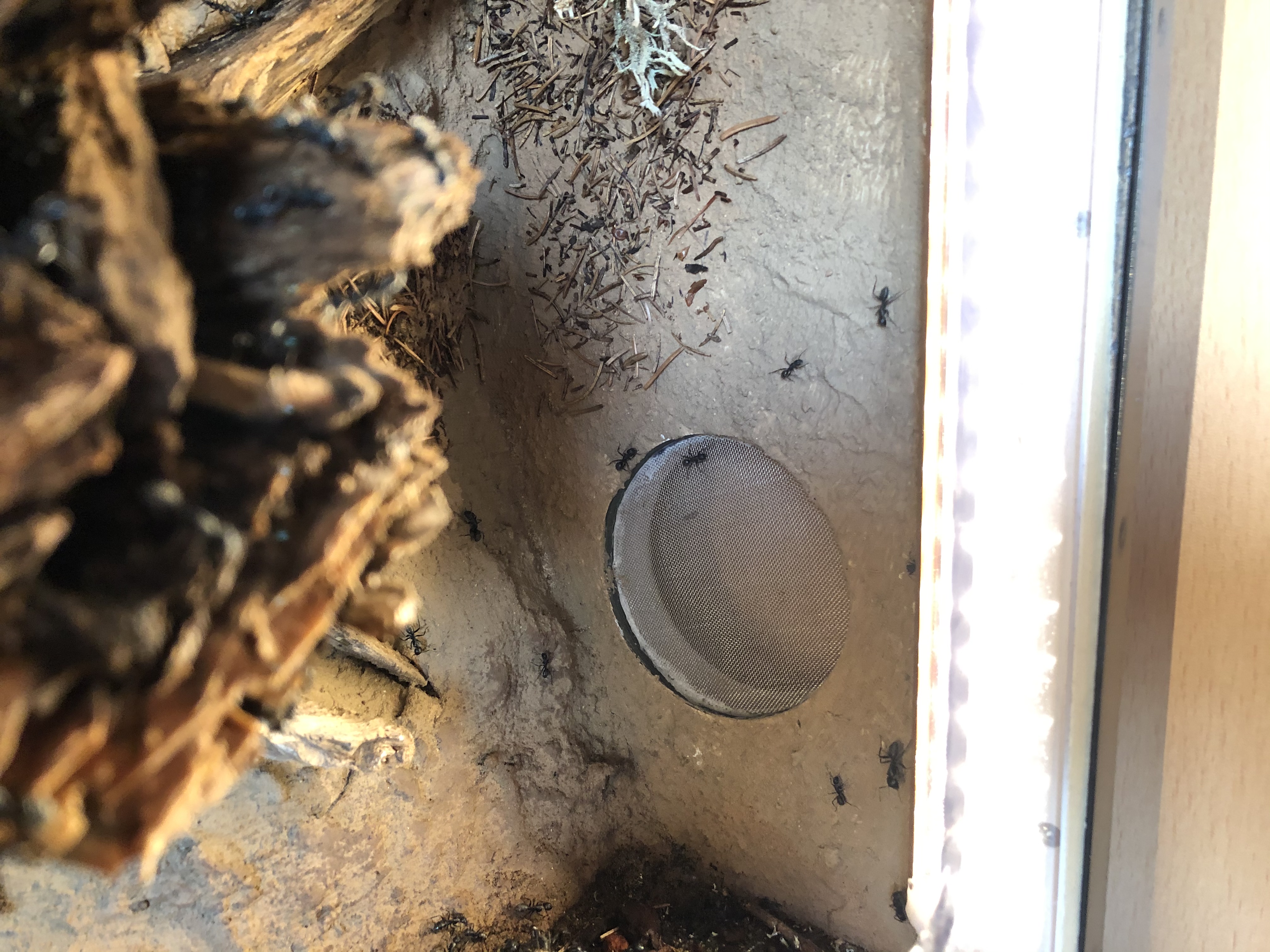 Damit das alles noch bisschen an ihren natĂŒrlichen Lebensraum, die KorkeichenwĂ€lder SĂŒdeuropas erinnert, habe ich noch einen Halbstamm ĂŒbers Nest gebaut mit einem Meander Labyrinth welches den Laufweg zur Arena verlĂ€ngert und weitere Beobachtunsmöglichkeiten bietet.