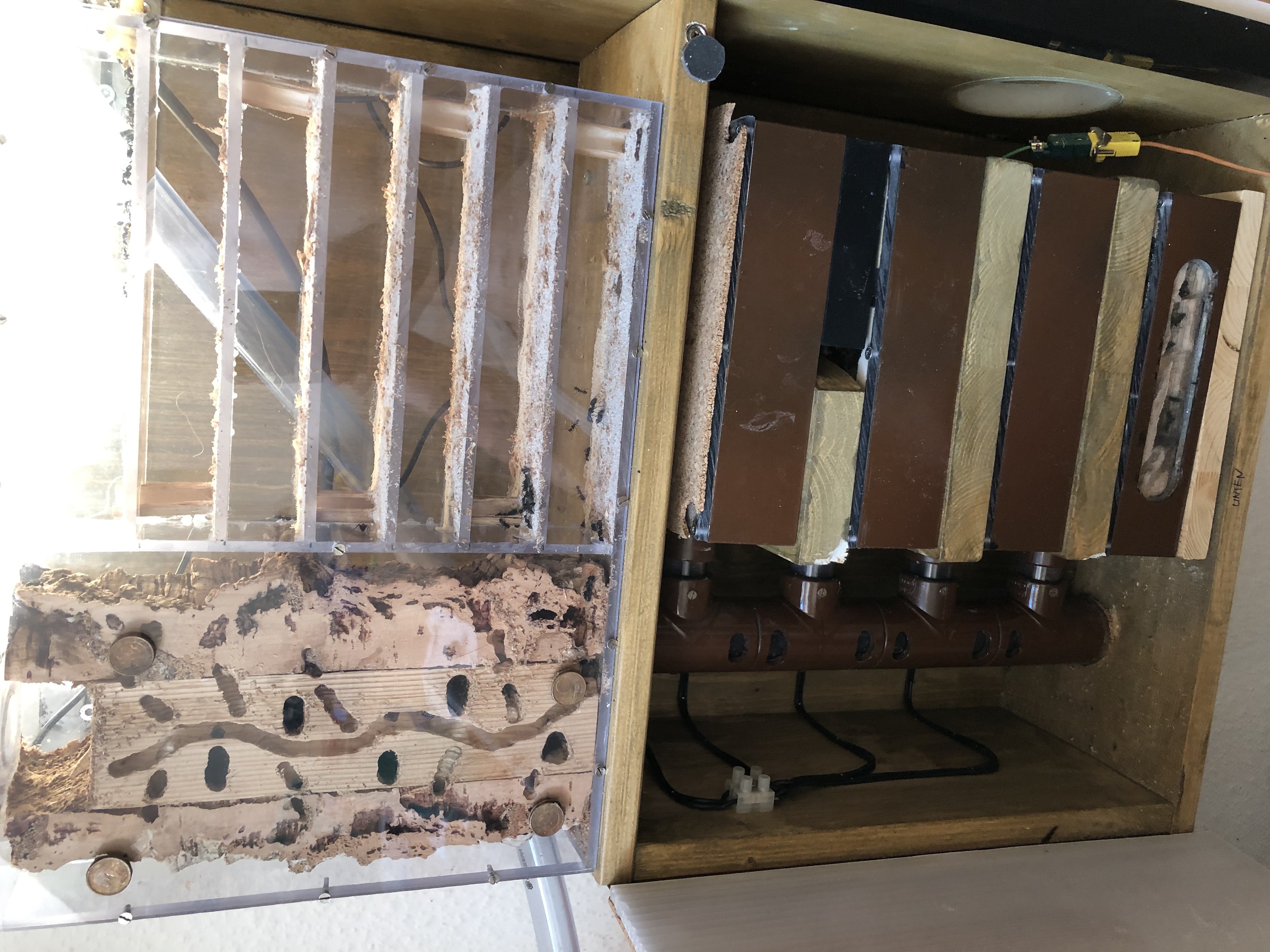 hier arbeitet je Formikarium ein in DĂ€mmstoff gelagerter leiser LĂŒfter. Alle 30min fĂŒr 15min wird frische Luft durch zwei seitliche EinlĂ€sse angesaugt Das wĂ€re das Gröbste zum Formikarium. Bisher funktioniert es wie geplant, es wurde gut angenommen. Die FĂŒtterung erfolgt auf den Plattformen die durch eine Luke zugĂ€nglich sind NatĂŒrlich musste auch ein neues gröĂeres Nest her. Der ganze Kasten wiegt schon ordentlich, also nix fĂŒr Transporte. Das Nest hĂ€ngt extern daneben und ich wollte es kompakt haben, zum Abnehmen wegen der