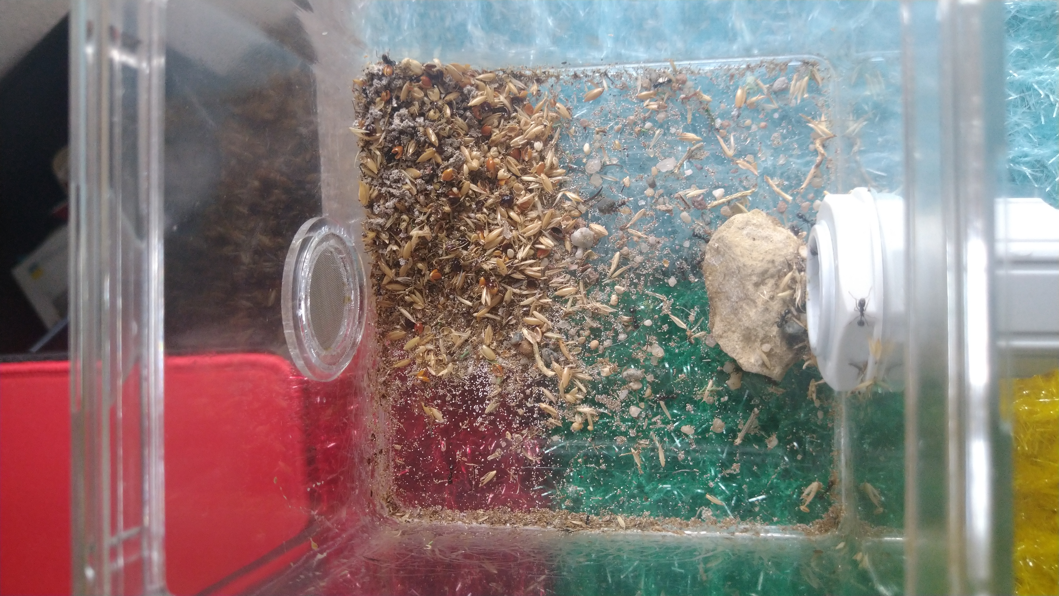Der Stein am Eingang ist komplett unterhölt, die Wurzel auch teilweise, den Sand haben sie mir auf die Wurzel getragen. Bepflanzung scheidet in meinen Augen bei Messor aus